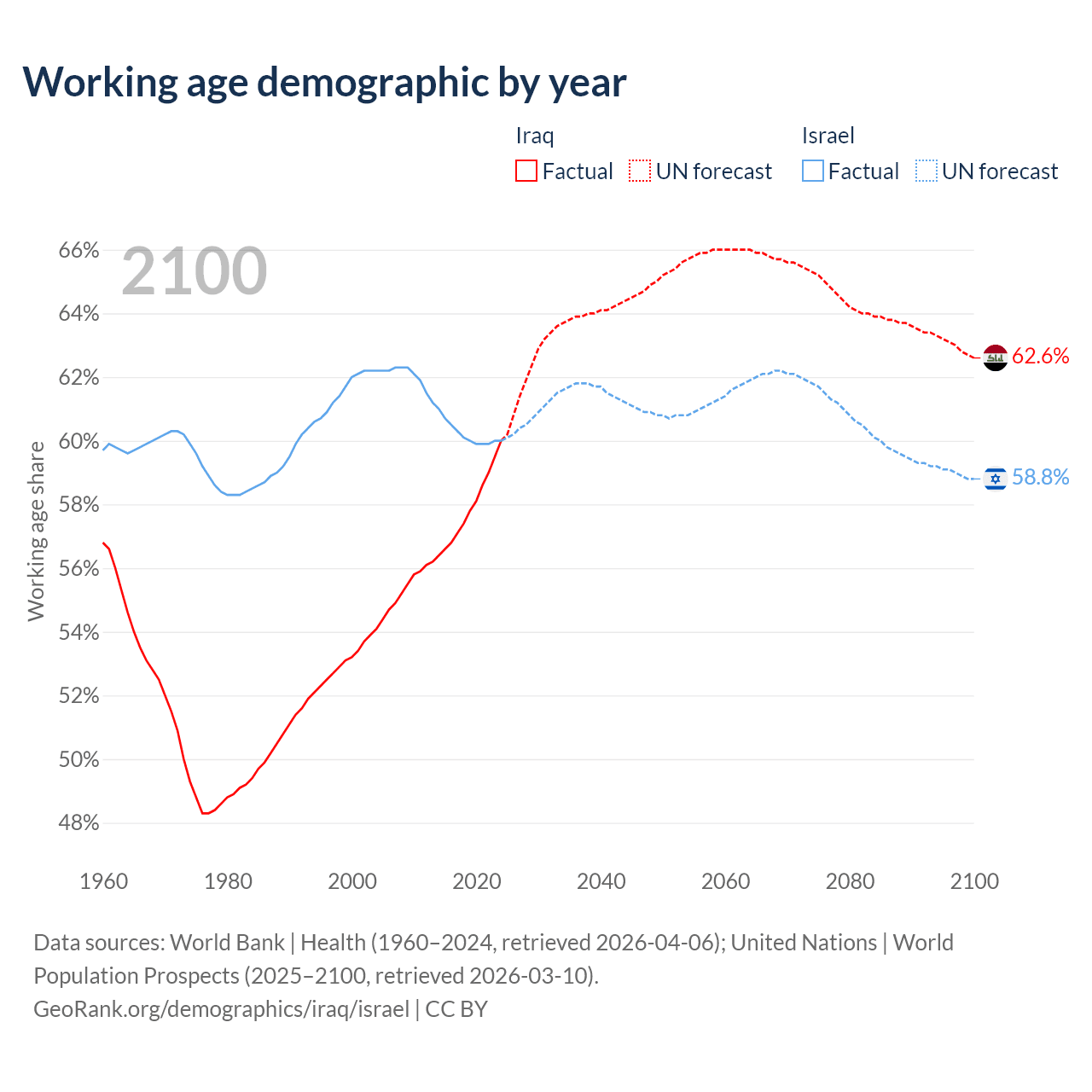 - Iraq has 29M working age adults (aged 15-64) vs 6.18M in Israel.