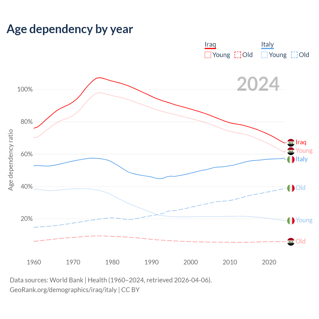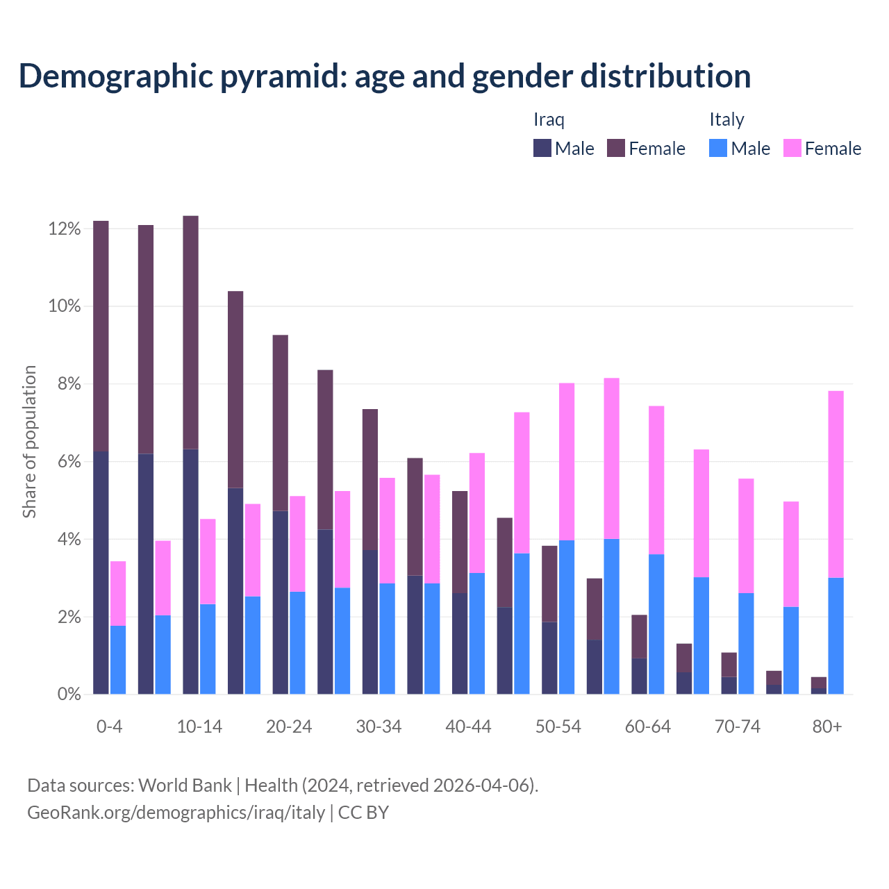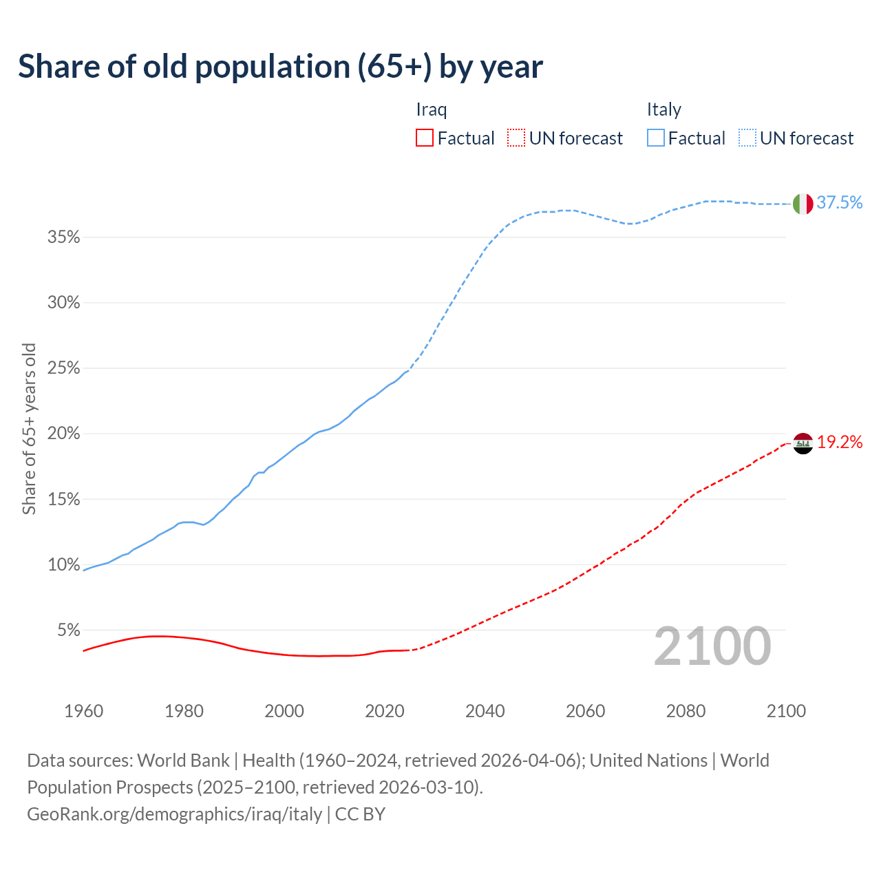 The share of older people aged 65 and over is 3.41% in Iraq and 24.6% in Italy. Life expectancy in Iraq compared to Italy .