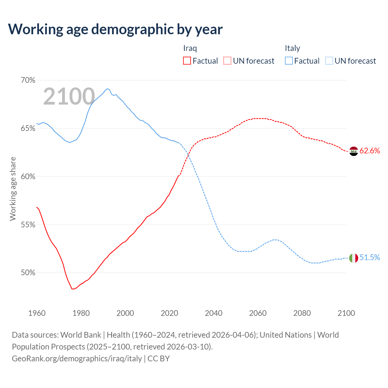 - Iraq has 29M working age adults (aged 15-64) vs 37.2M in Italy.