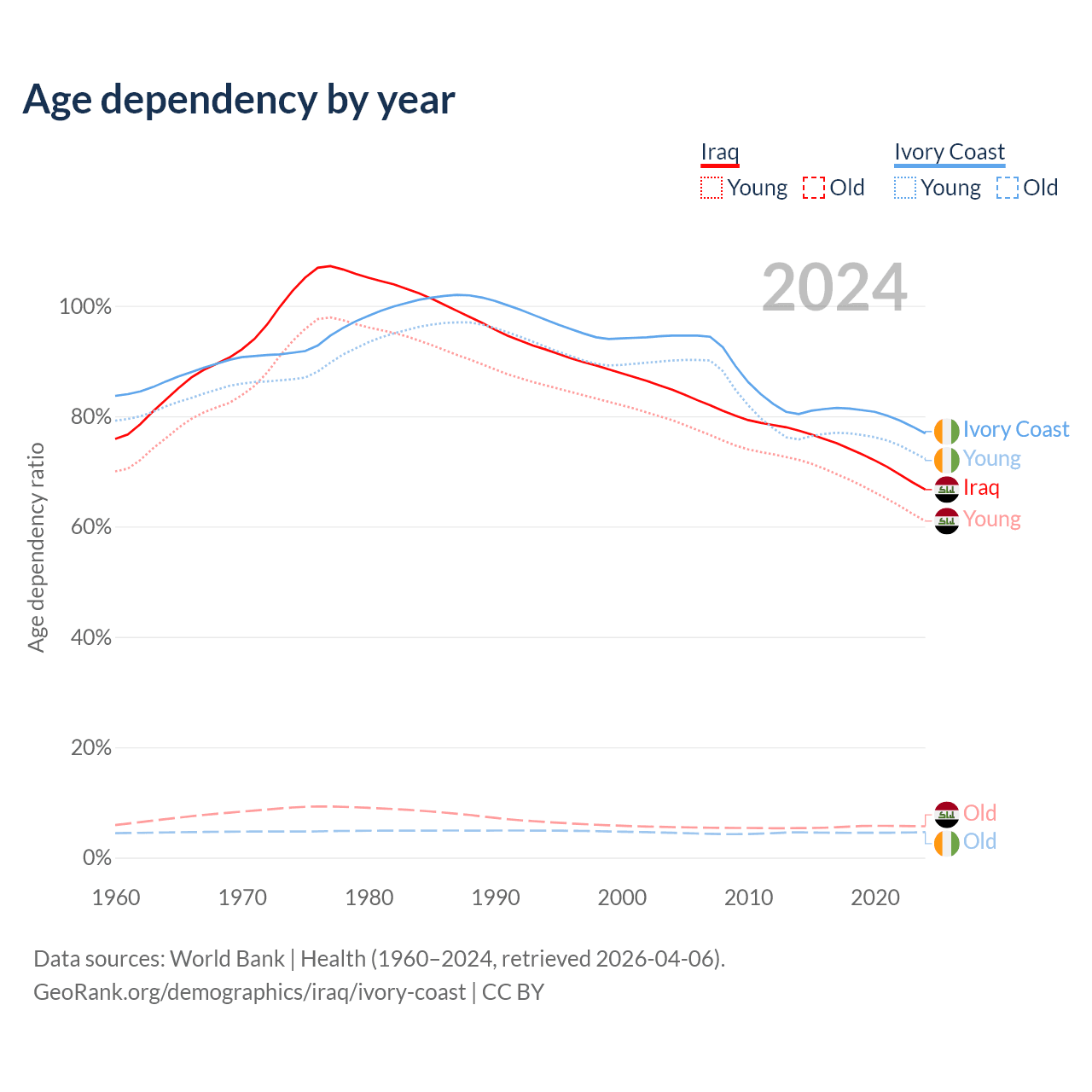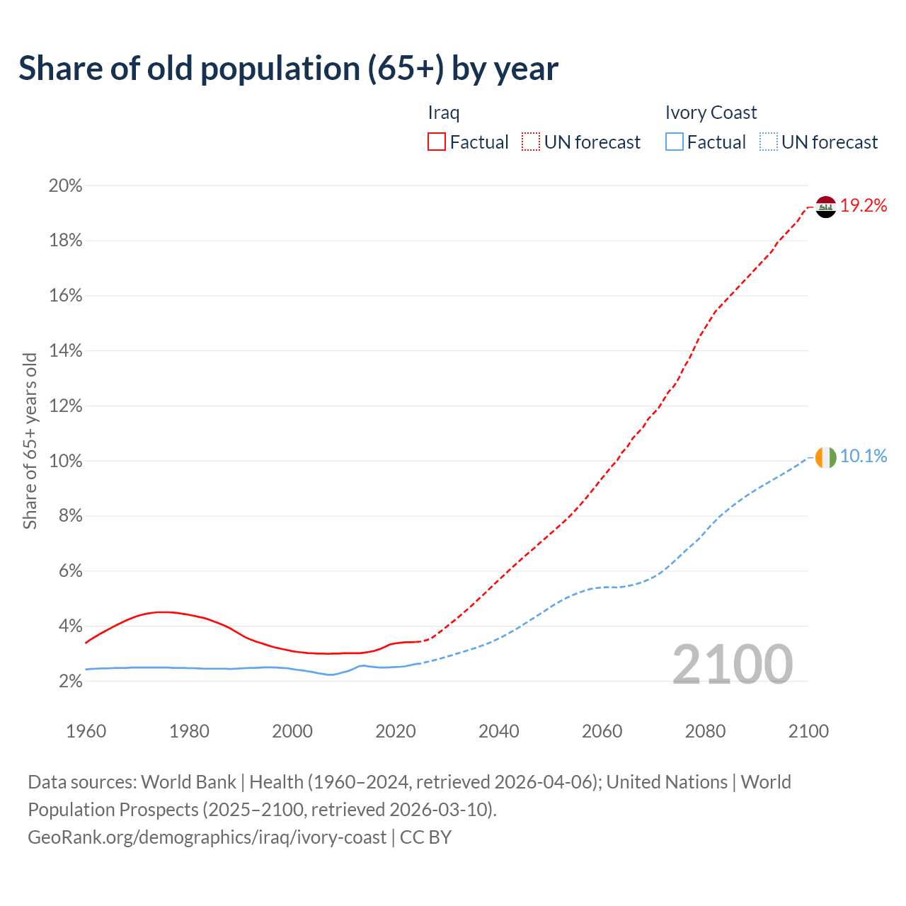 - The share of old-age demographic (65+) in Iraq is 3.41% vs 2.61% in Ivory Coast.