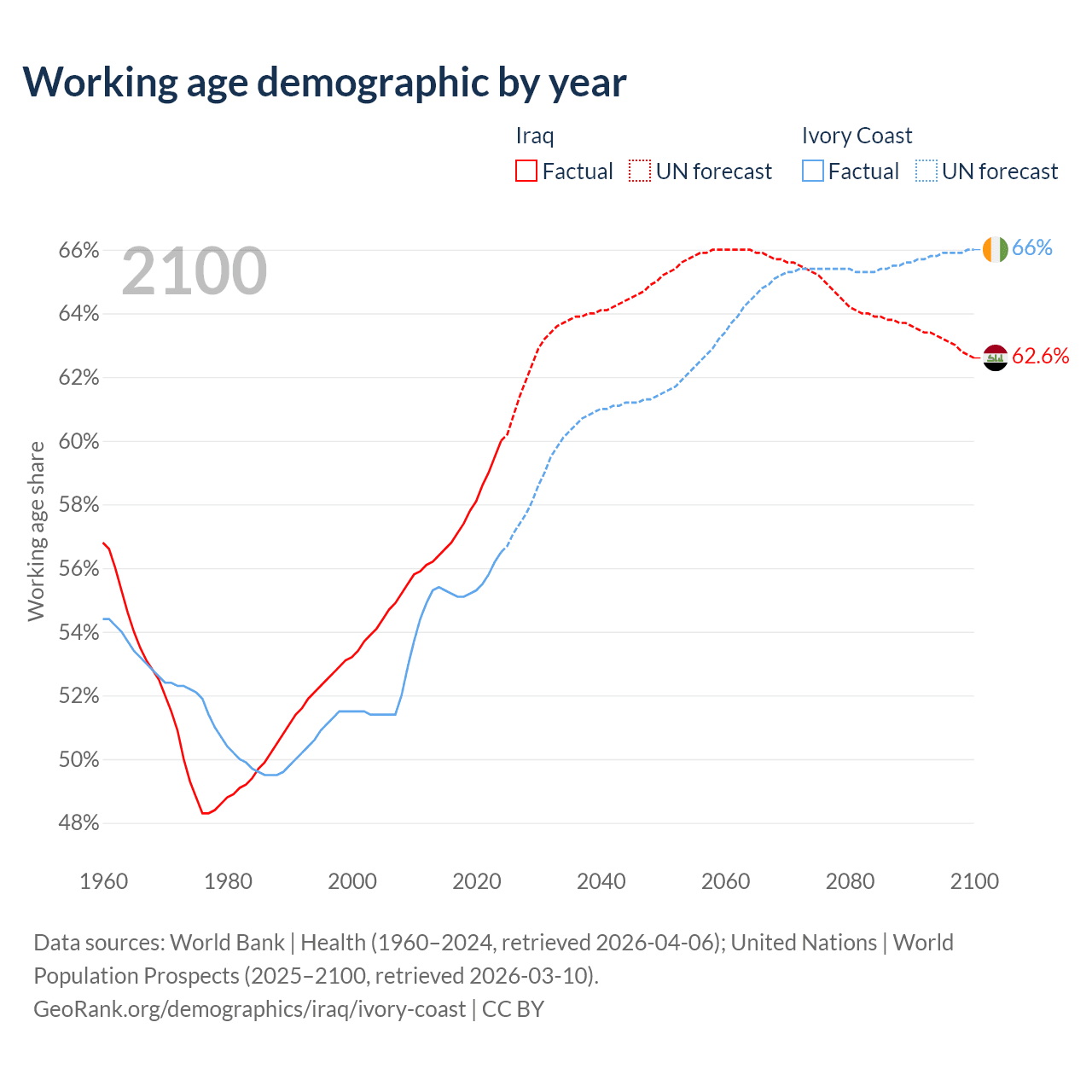 - Iraq has 29M working age adults (aged 15-64) vs 19.1M in Ivory Coast.