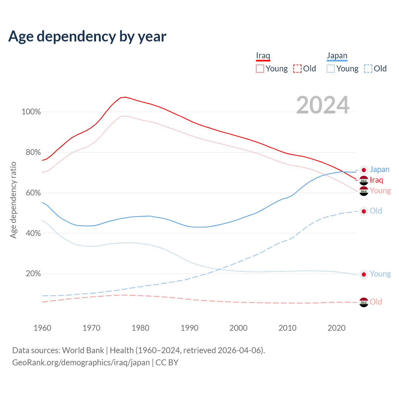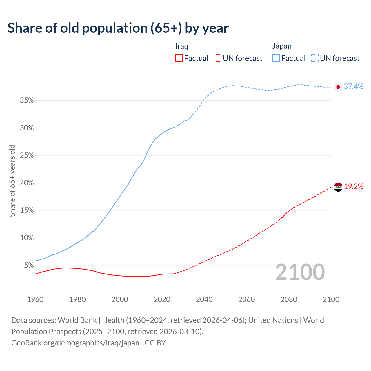 The share of older people aged 65 and over is 3.41% in Iraq and 29.8% in Japan. Life expectancy in Iraq compared to Japan .