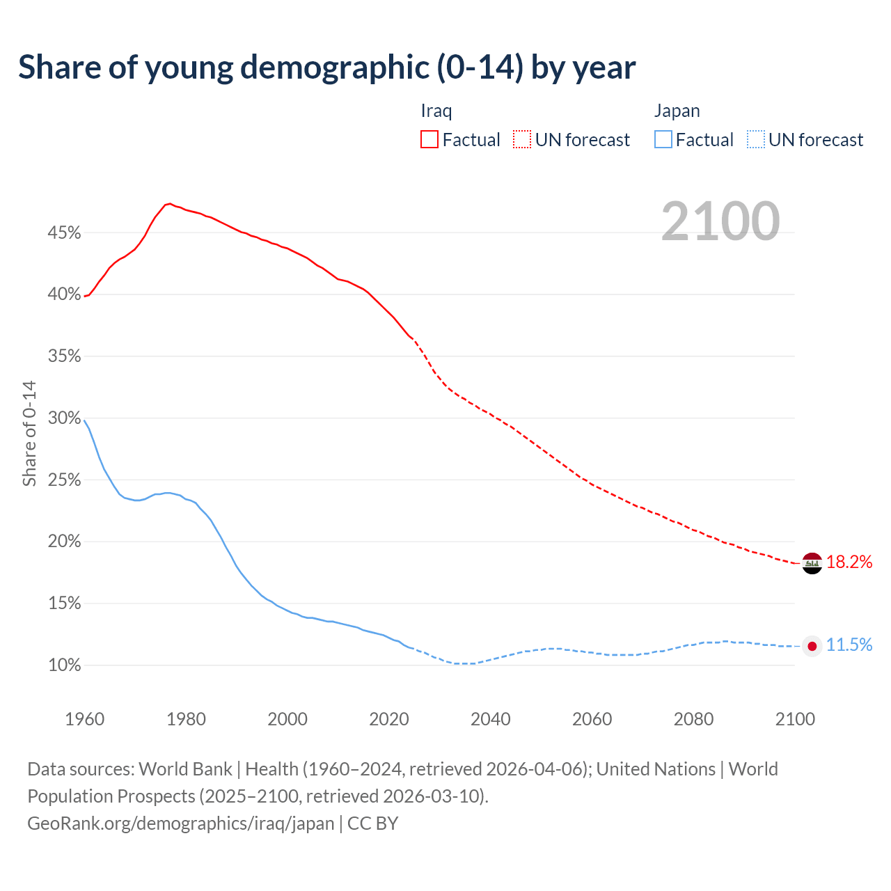 - The share of young demographic (0-15 years old) in Iraq is 36.6% vs 11.4% in Japan.