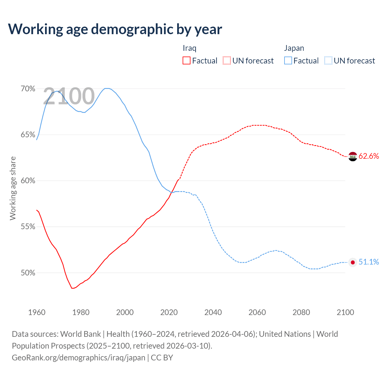 - Iraq has 29M working age adults (aged 15-64) vs 72.1M in Japan.