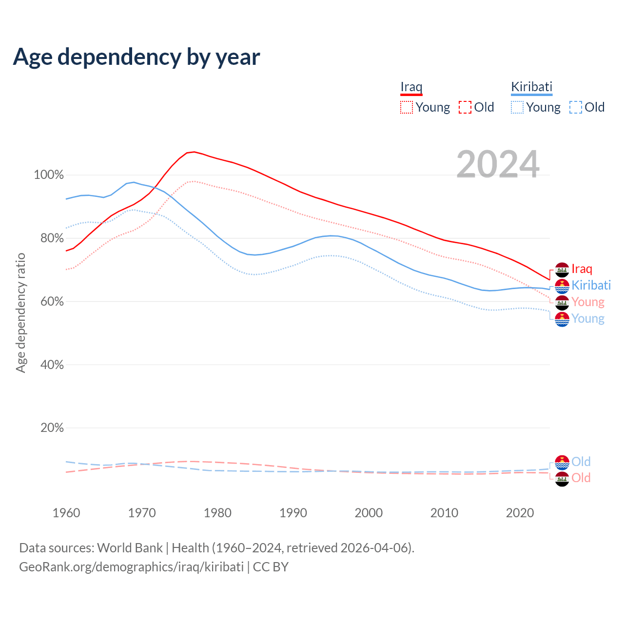 - The share of old-age demographic (65+) in Iraq is 3.41% vs 4.24% in Kiribati.