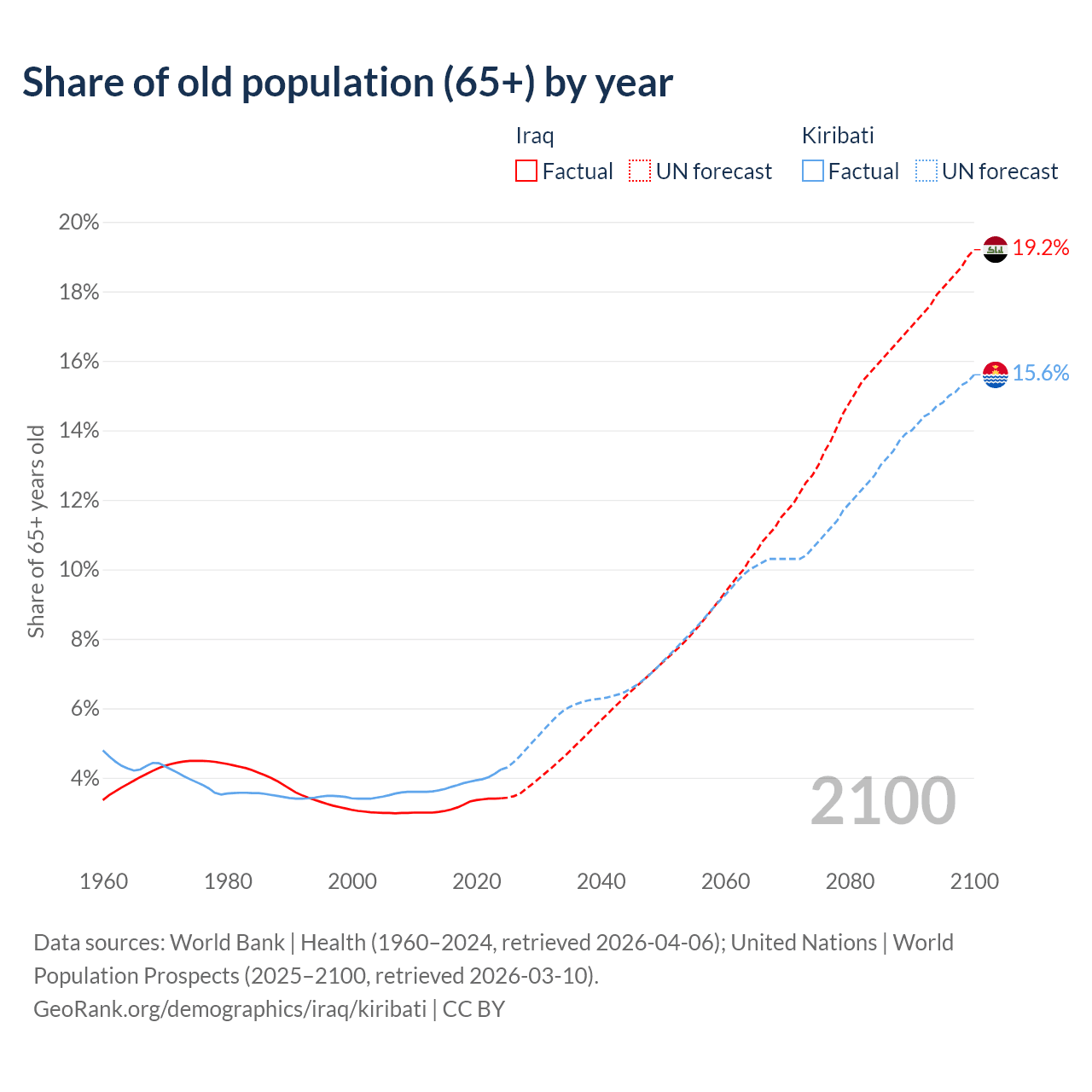 The share of older people aged 65 and over is 3.41% in Iraq and 4.24% in Kiribati. Life expectancy in Iraq compared to Kiribati .