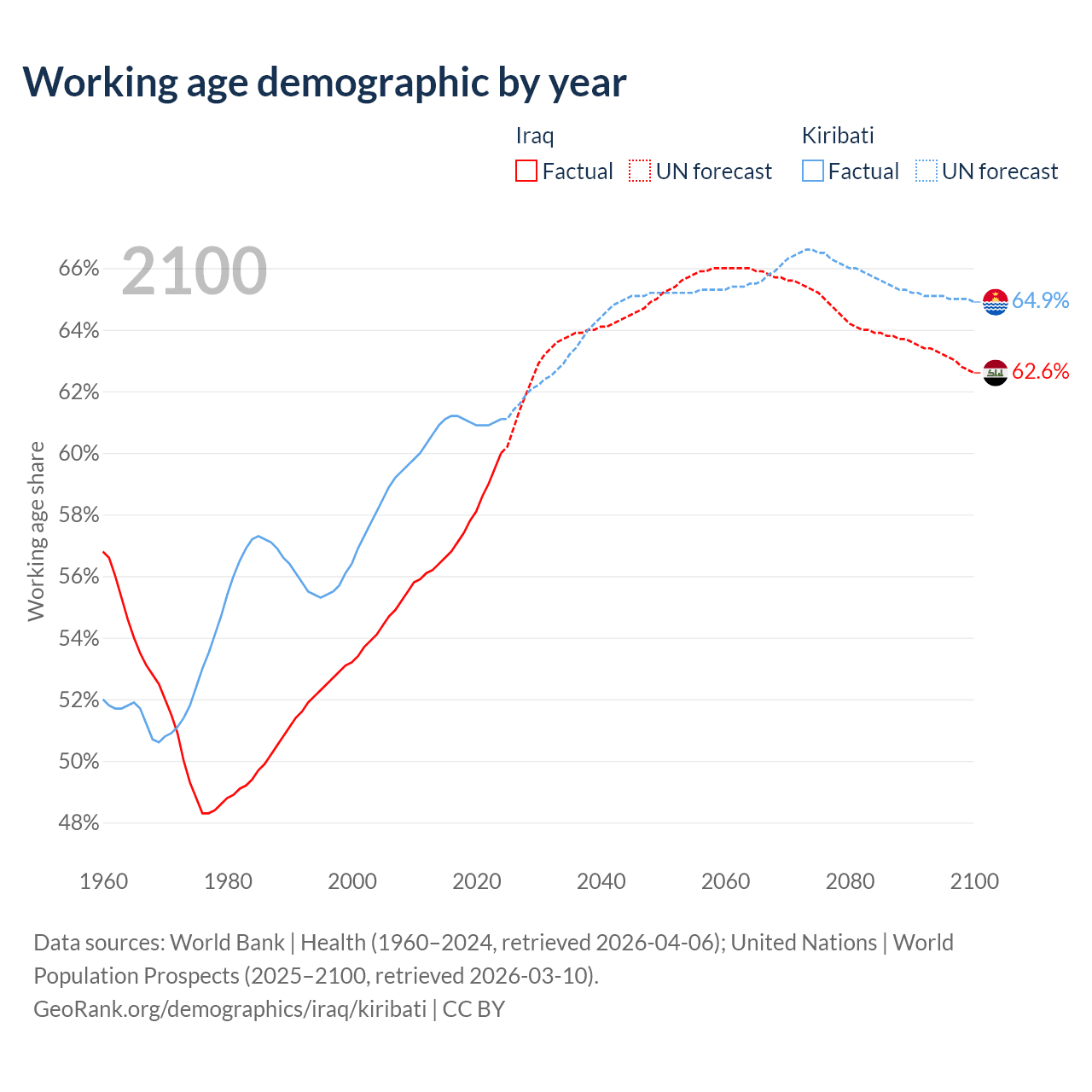 - The share of young demographic (0-15 years old) in Iraq is 36.6% vs 34.7% in Kiribati.