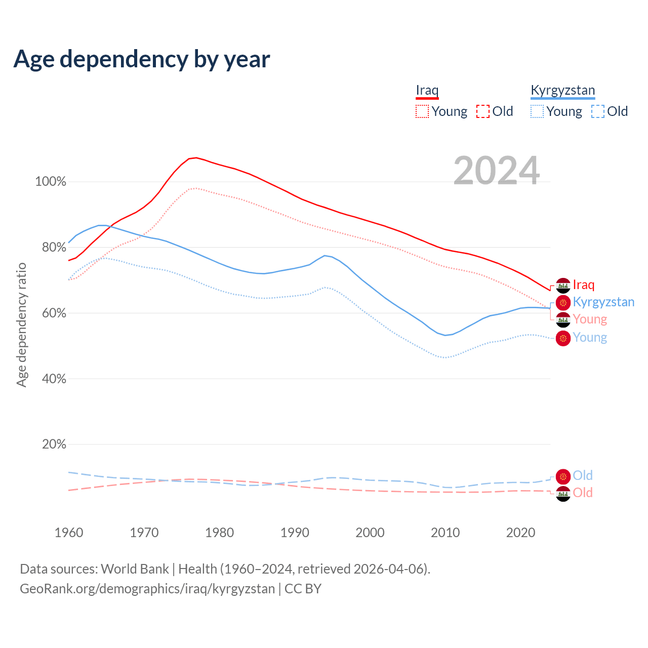 The share of older people aged 65 and over is 3.41% in Iraq and 5.68% in Kyrgyzstan. Life expectancy in Iraq compared to Kyrgyzstan .