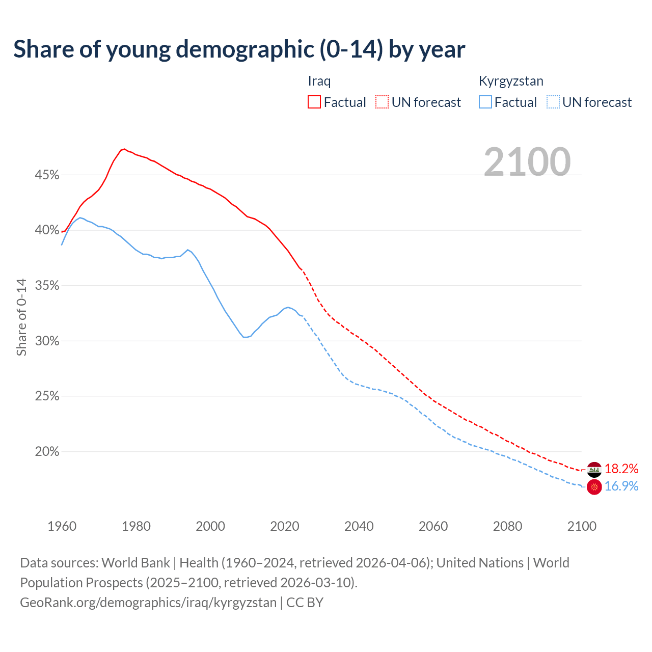 - The share of young demographic (0-15 years old) in Iraq is 36.6% vs 32.3% in Kyrgyzstan.