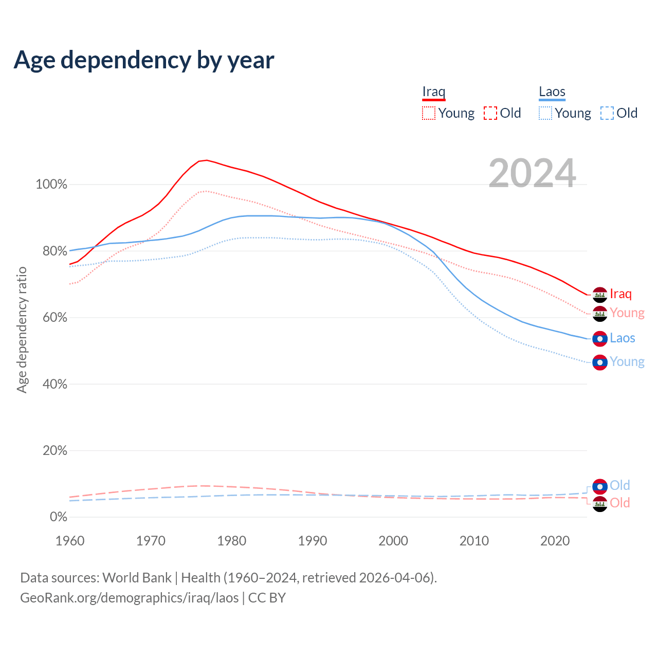 - Iraq is ranked 151/196 by median age (oldest to youngest) vs 130/196 for Laos.