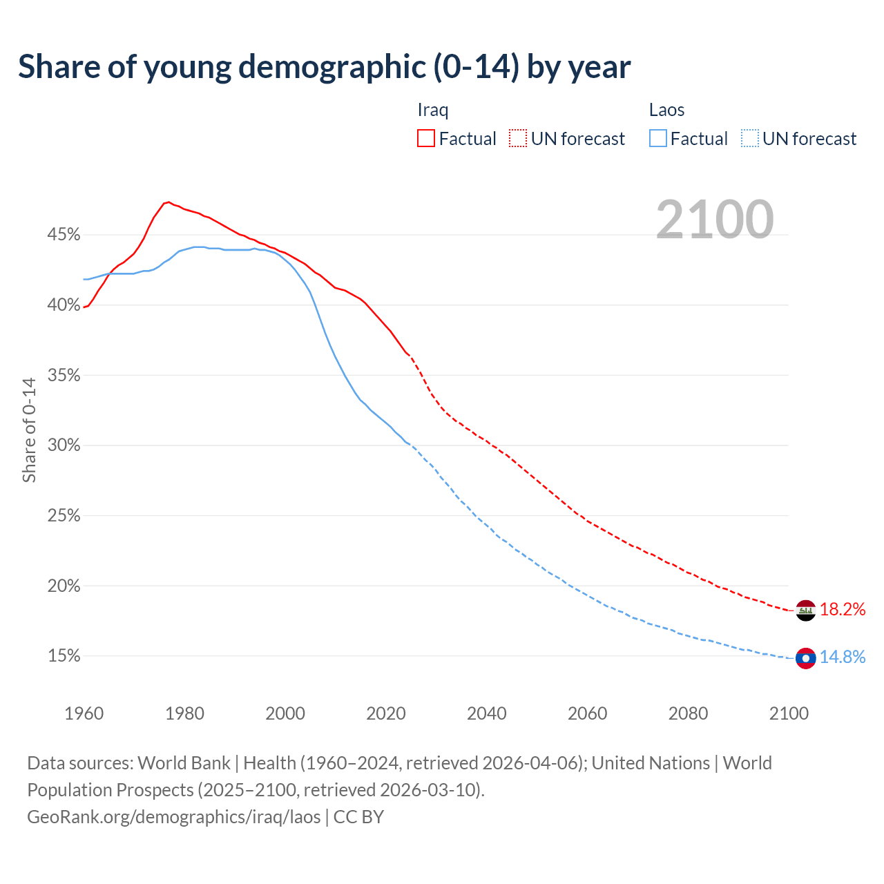 - The share of young demographic (0-15 years old) in Iraq is 36.6% vs 30.2% in Laos.