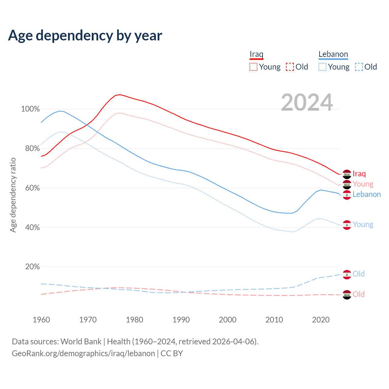 The share of older people aged 65 and over is 3.41% in Iraq and 10.1% in Lebanon. Life expectancy in Iraq compared to Lebanon .