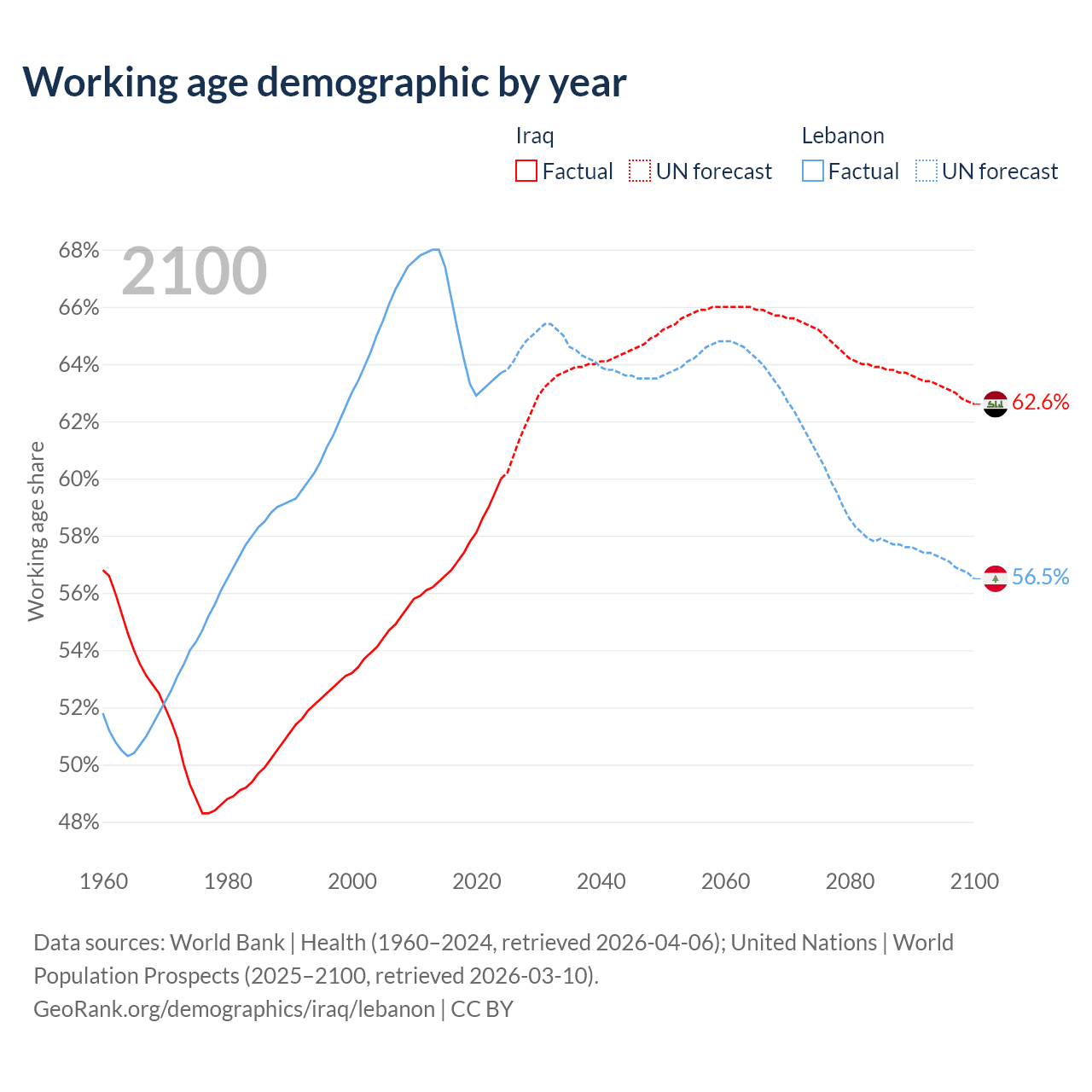 Median age Iraq vs Lebanon, 1960-2100