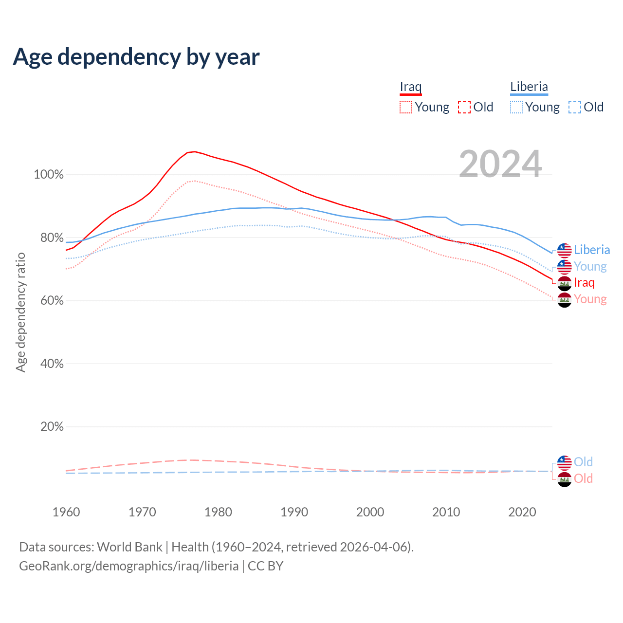 - The share of old-age demographic (65+) in Iraq is 3.41% vs 3.3% in Liberia.