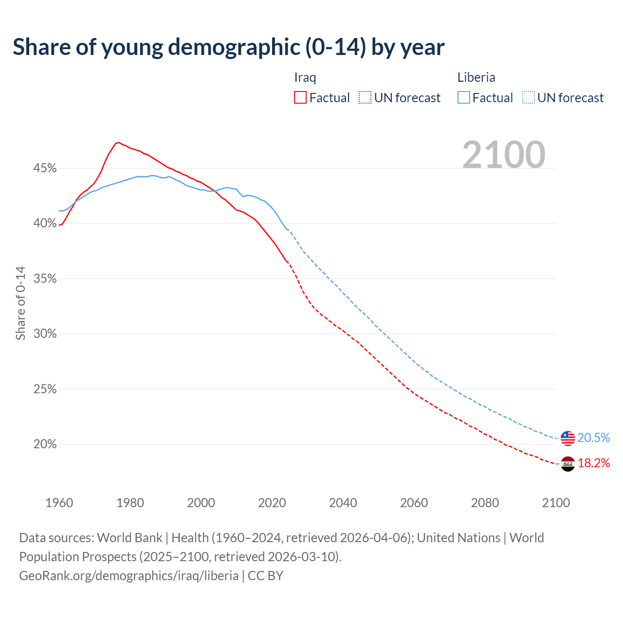 - The share of young demographic (0-15 years old) in Iraq is 36.6% vs 39.5% in Liberia.