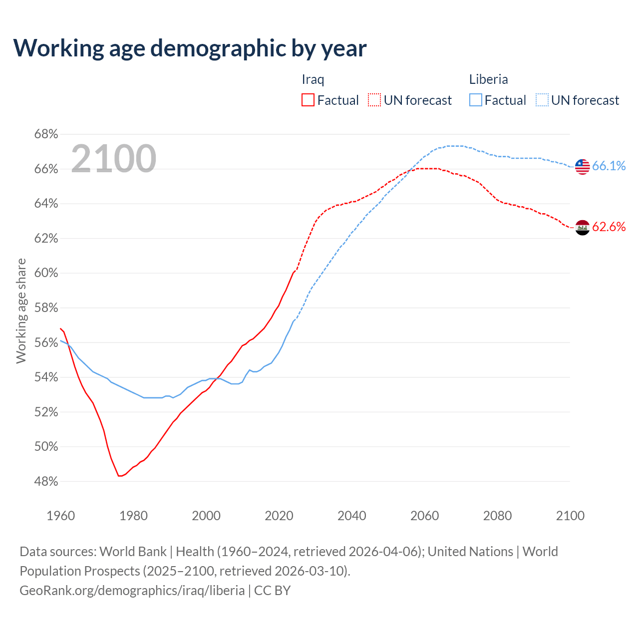 The share of older people aged 65 and over is 3.41% in Iraq and 3.3% in Liberia. Life expectancy in Iraq compared to Liberia .