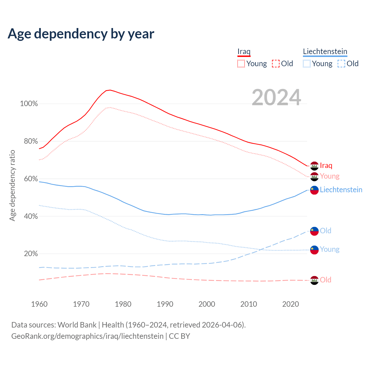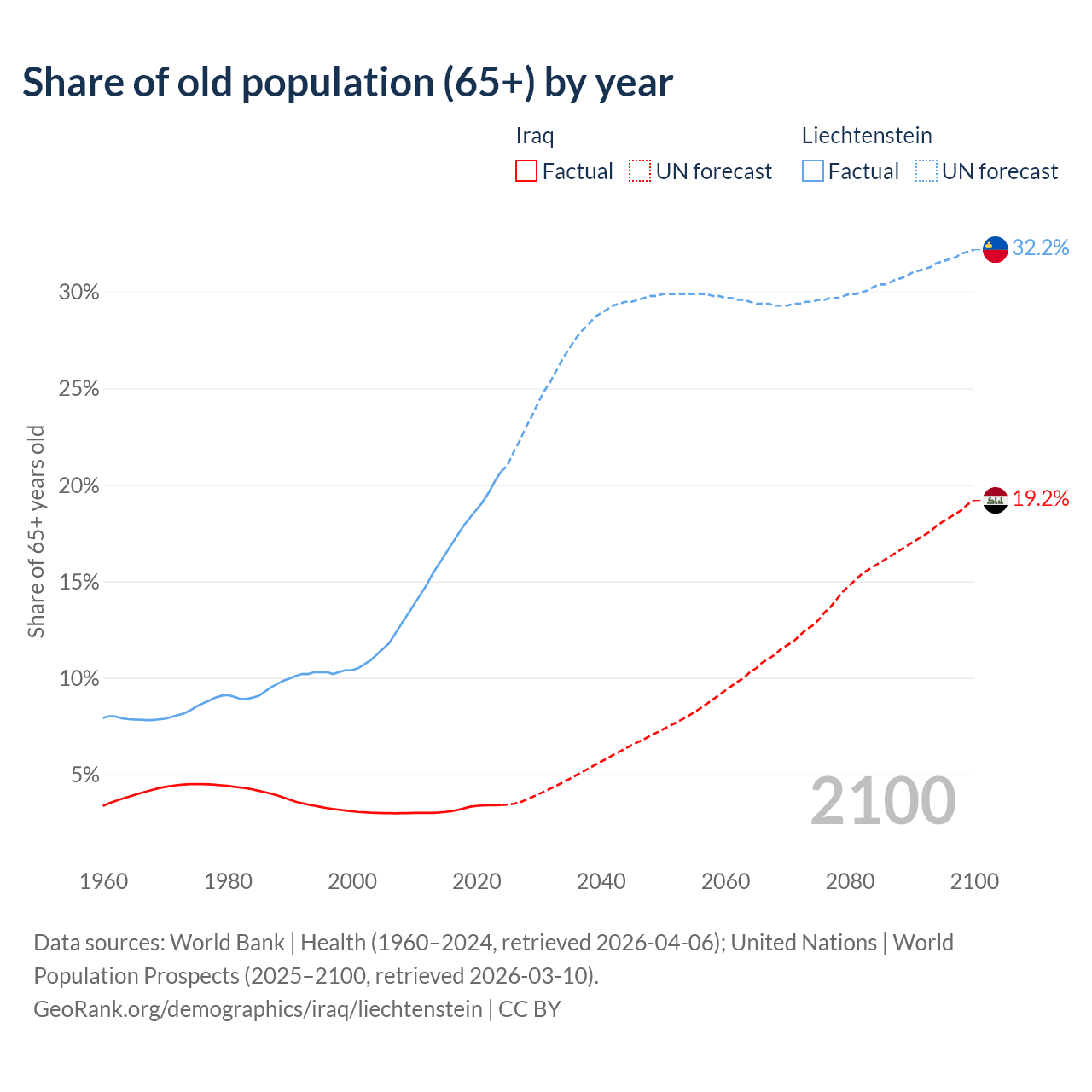 - The share of old-age demographic (65+) in Iraq is 3.41% vs 20.7% in Liechtenstein.