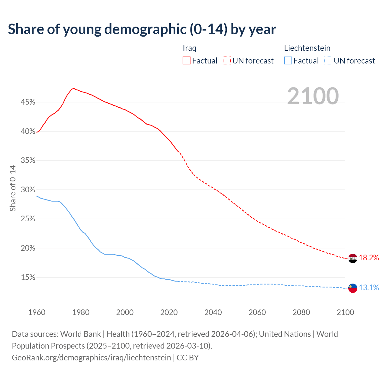 - The share of young demographic (0-15 years old) in Iraq is 36.6% vs 14.3% in Liechtenstein.