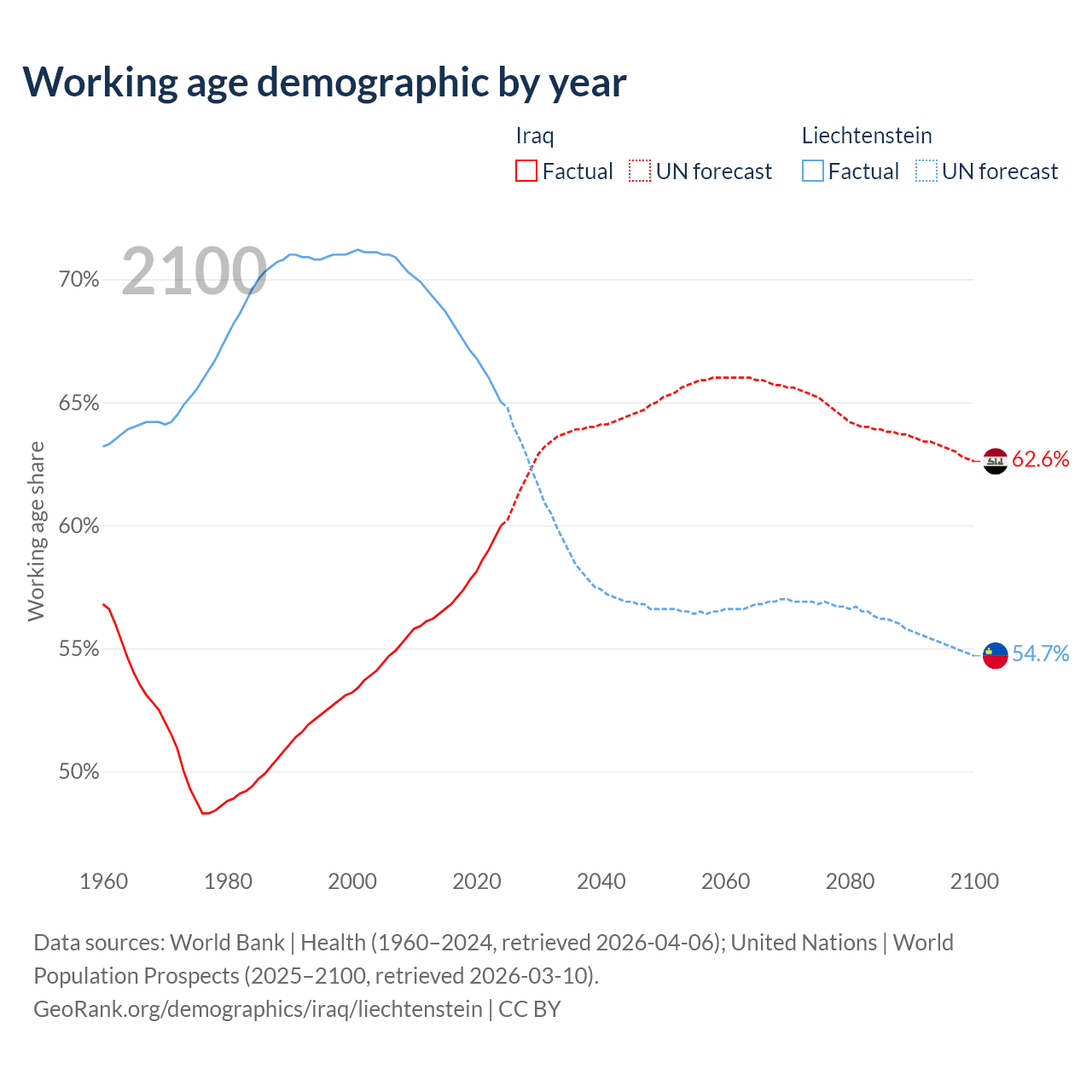 The share of older people aged 65 and over is 3.41% in Iraq and 20.7% in Liechtenstein. Life expectancy in Iraq compared to Liechtenstein .