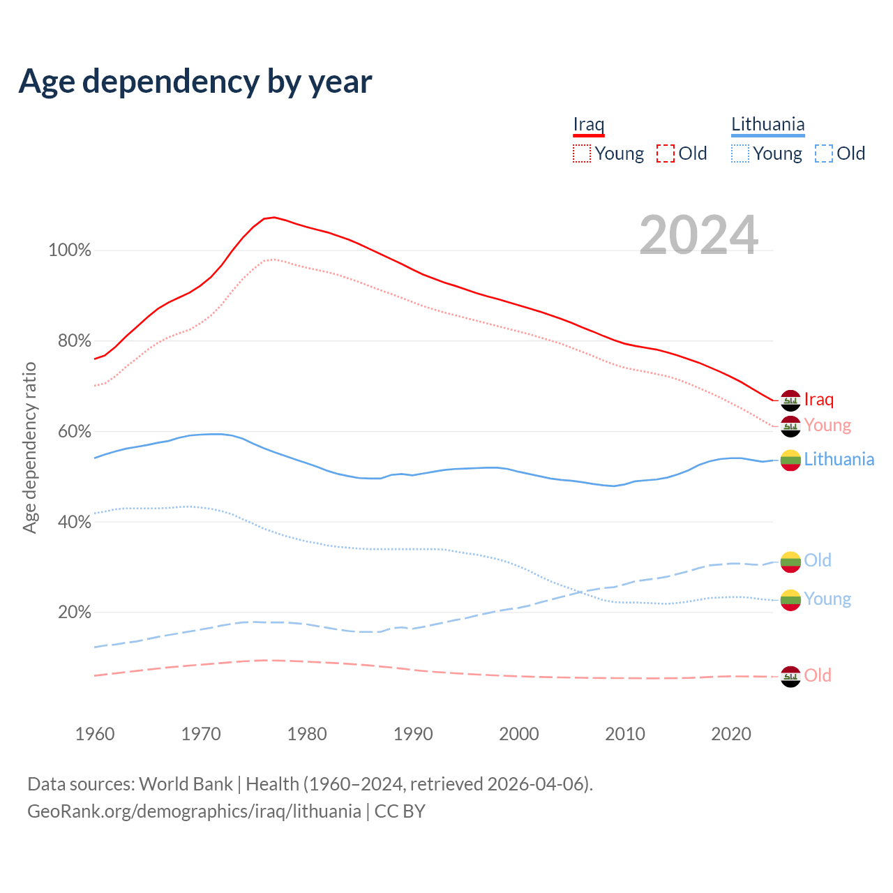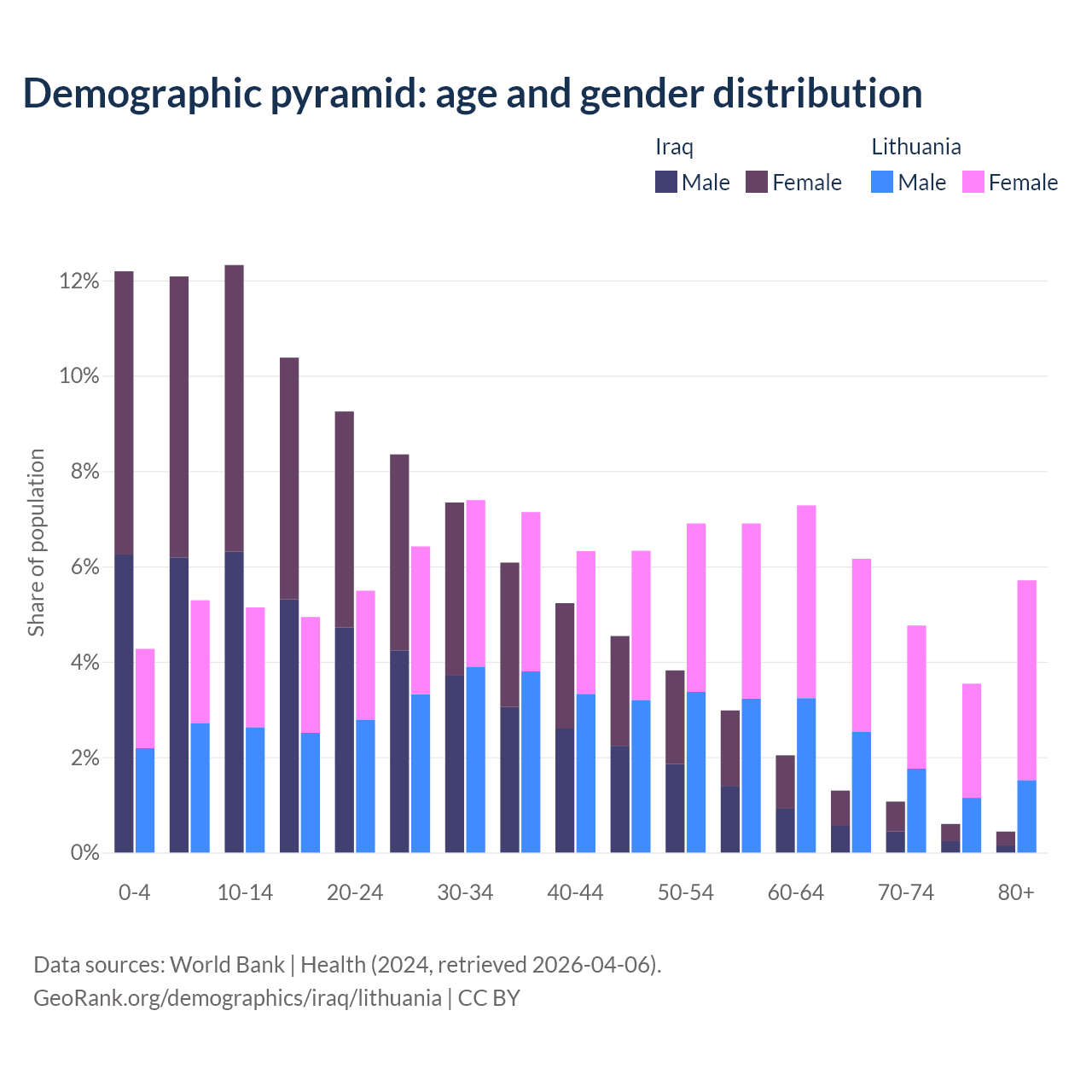 - Iraq is ranked 151/196 by median age (oldest to youngest) vs 28/196 for Lithuania.