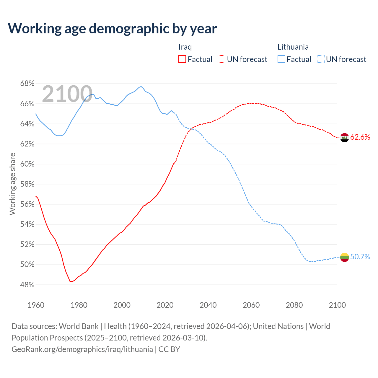 - Iraq has 29M working age adults (aged 15-64) vs 1.84M in Lithuania.