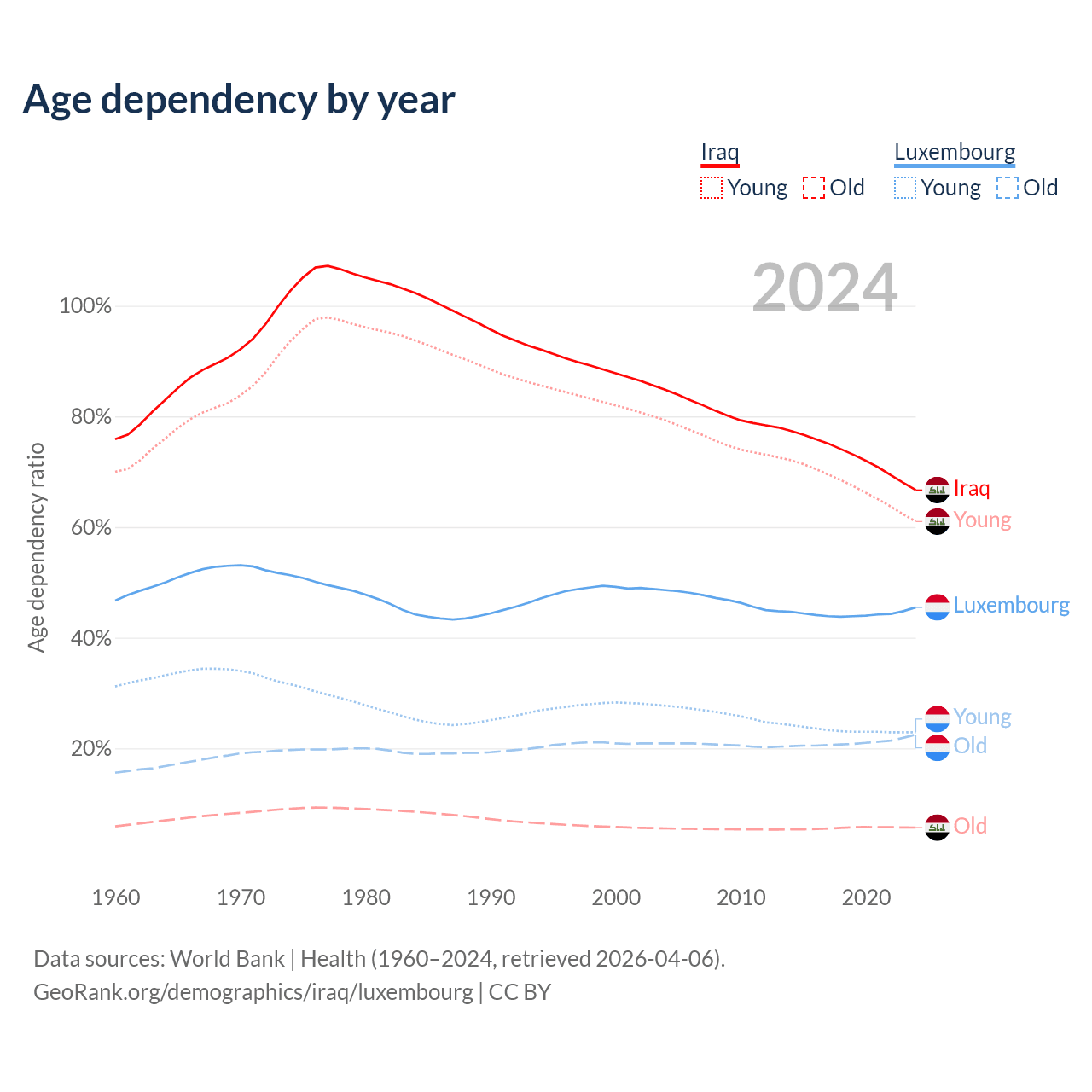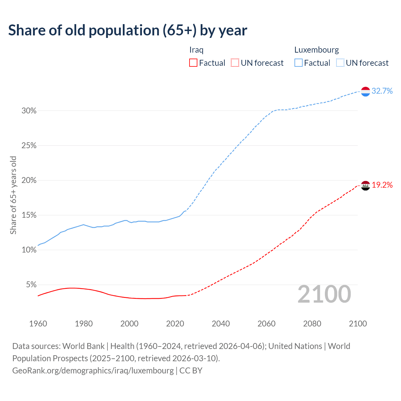 The share of older people aged 65 and over is 3.41% in Iraq and 15.5% in Luxembourg. Life expectancy in Iraq compared to Luxembourg .