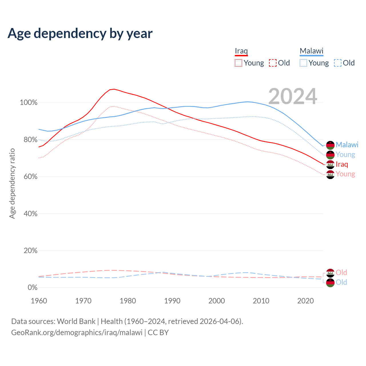 - The share of old-age demographic (65+) in Iraq is 3.41% vs 2.59% in Malawi.
