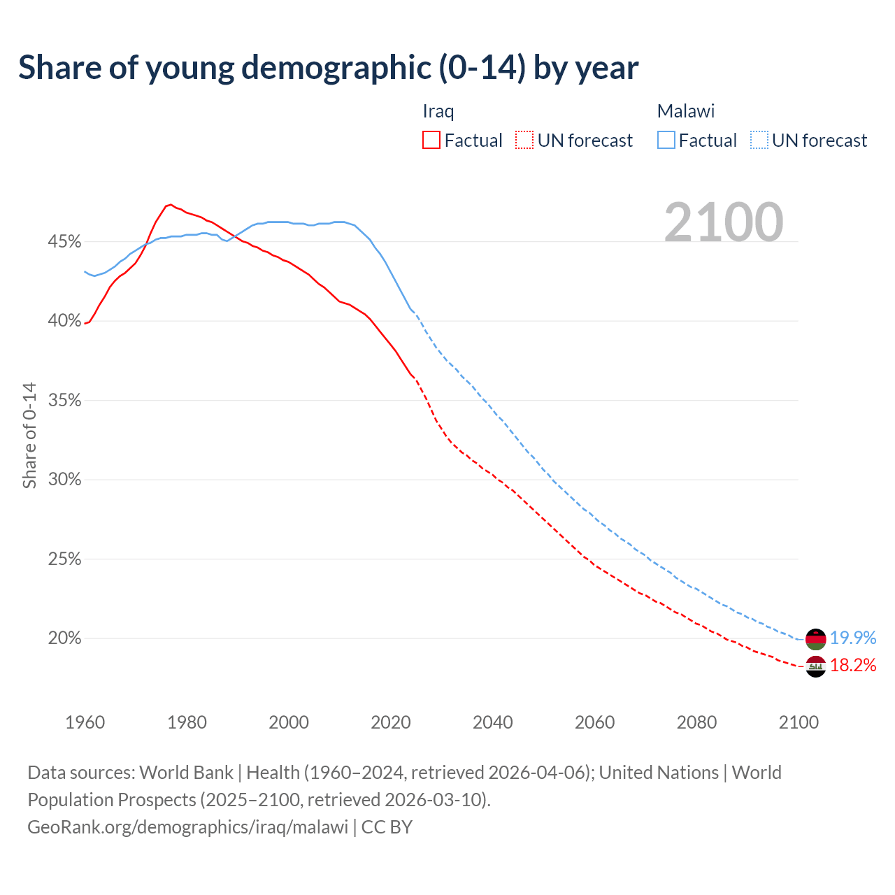 - The share of young demographic (0-15 years old) in Iraq is 36.6% vs 40.7% in Malawi.