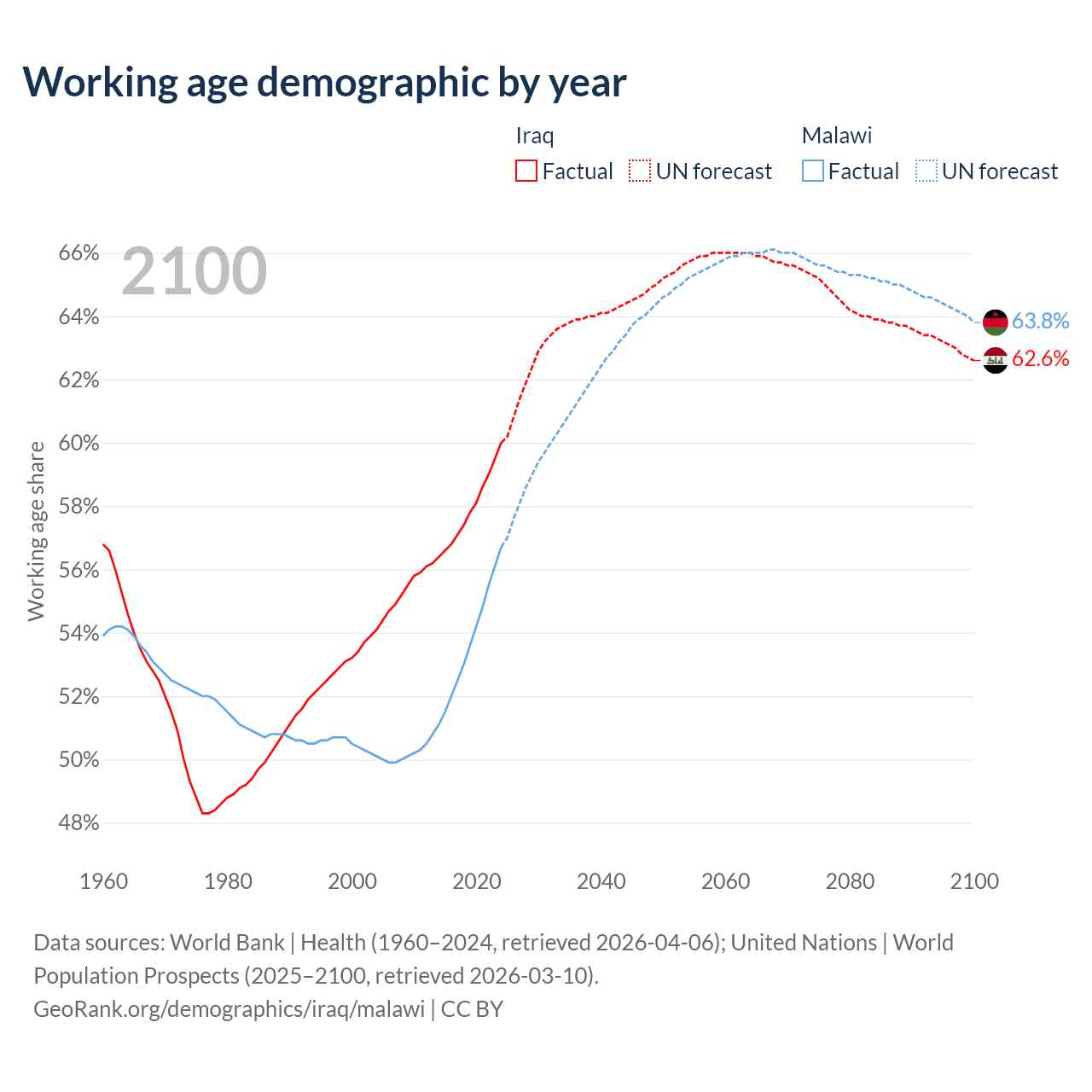 - Iraq has 29M working age adults (aged 15-64) vs 13M in Malawi.