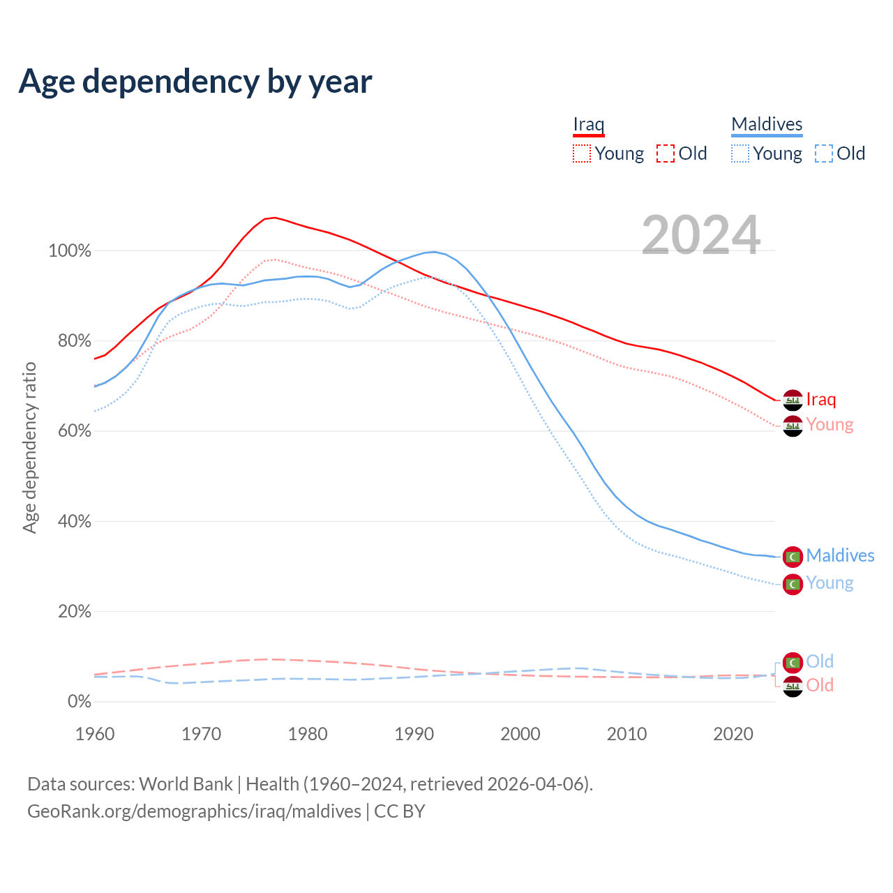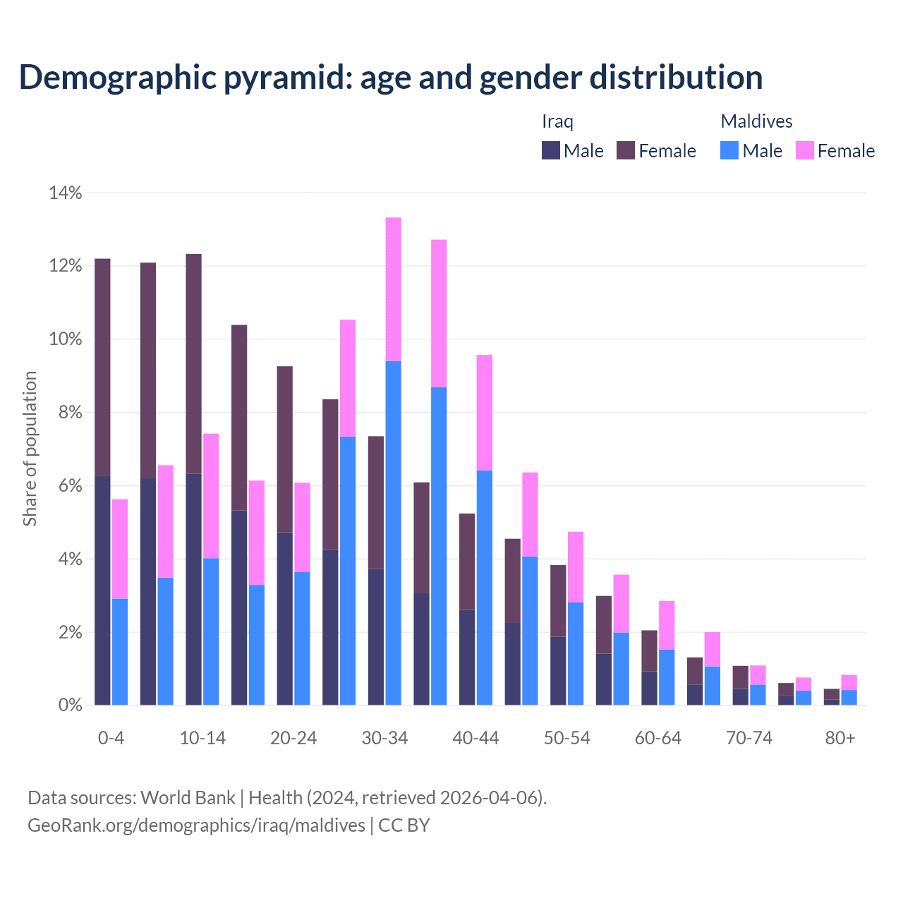 - Iraq is ranked 151/196 by median age (oldest to youngest) vs 90/196 for Maldives.