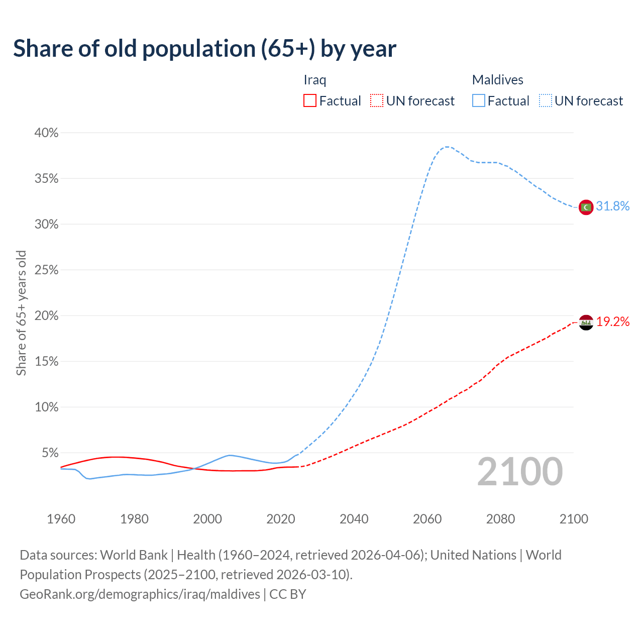 - The share of old-age demographic (65+) in Iraq is 3.41% vs 4.64% in Maldives.