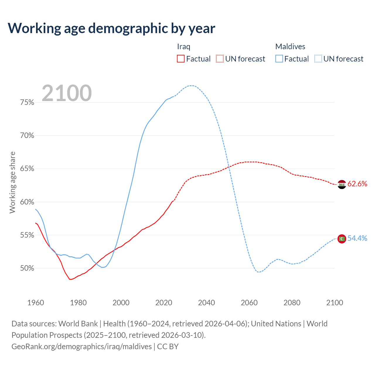 - Iraq has 29M working age adults (aged 15-64) vs 403K in Maldives.