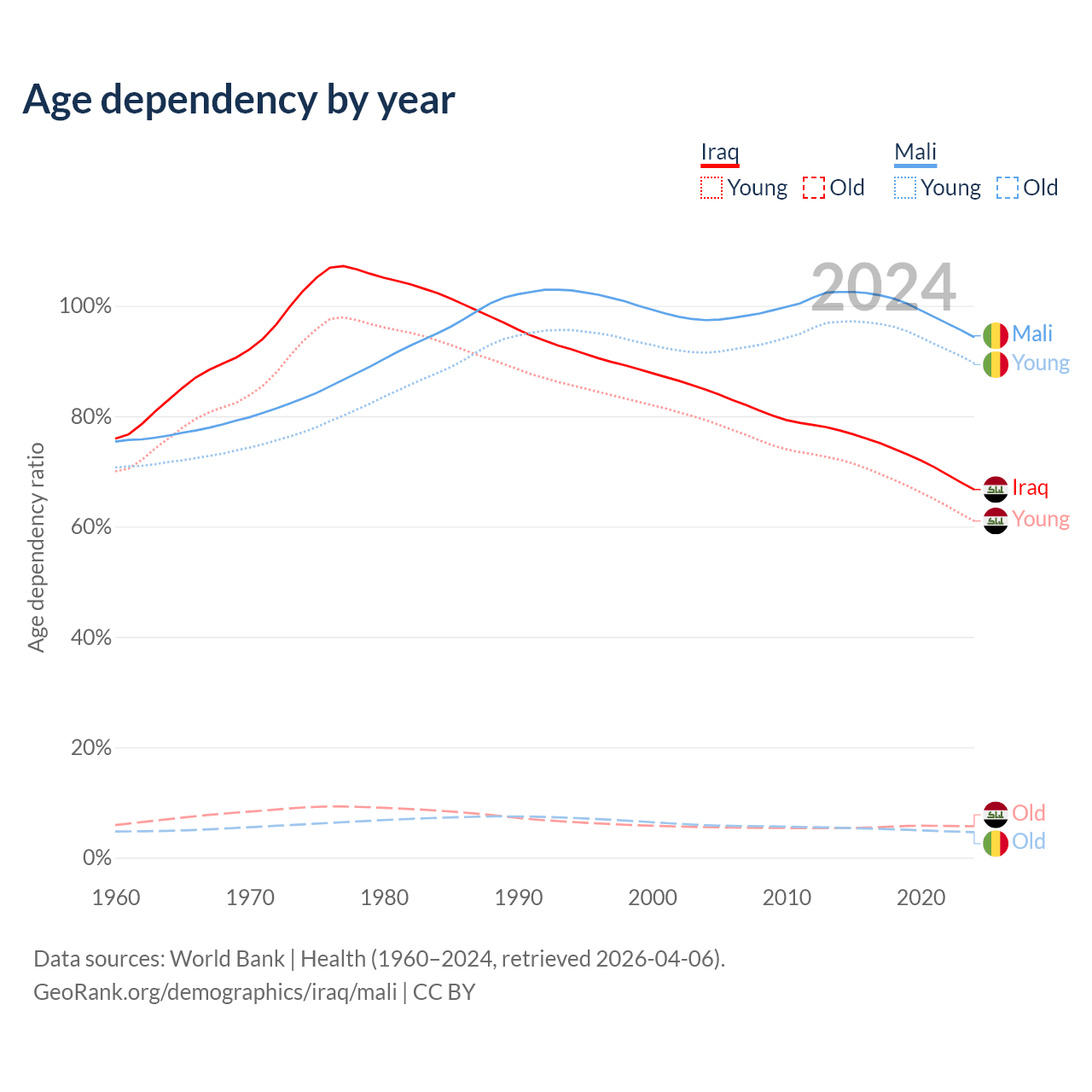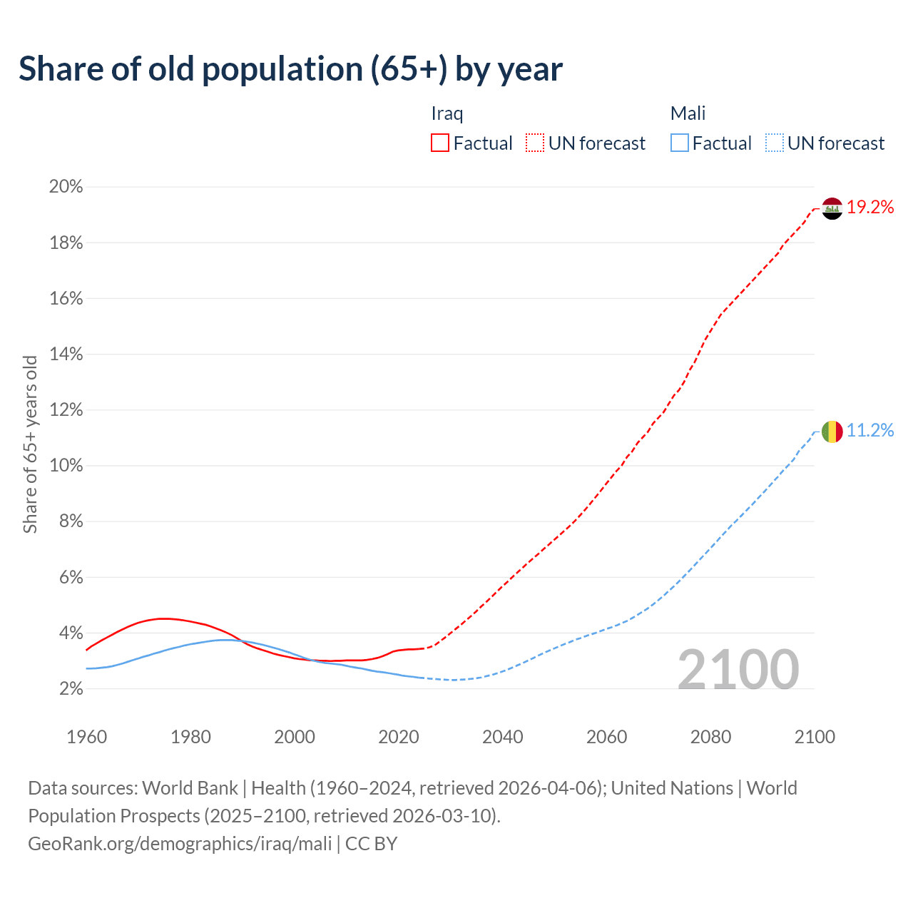 - The share of old-age demographic (65+) in Iraq is 3.41% vs 2.38% in Mali.