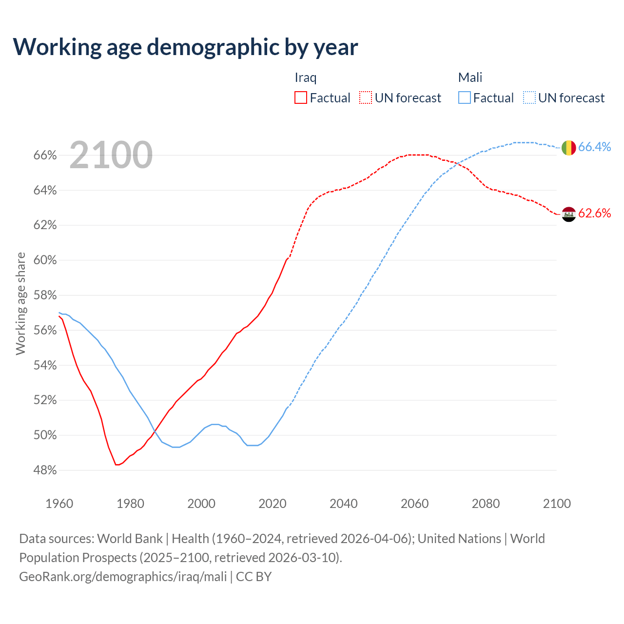 - Iraq has 29M working age adults (aged 15-64) vs 13.5M in Mali.
