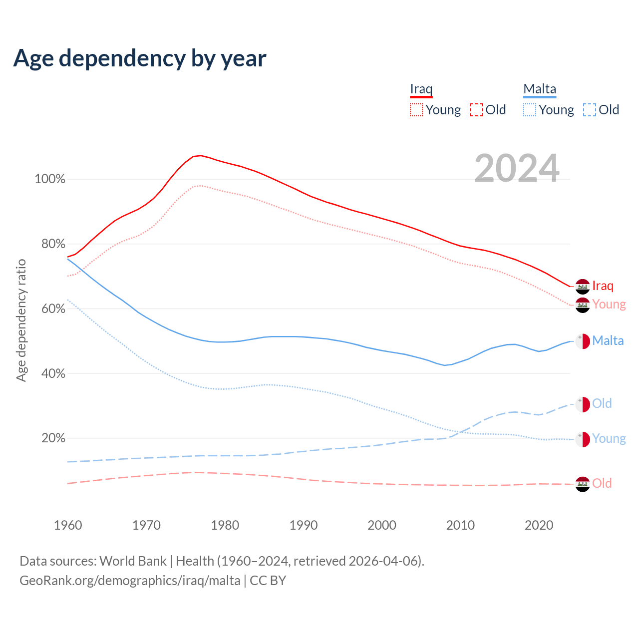 The share of older people aged 65 and over is 3.41% in Iraq and 20.2% in Malta. Life expectancy in Iraq compared to Malta .
