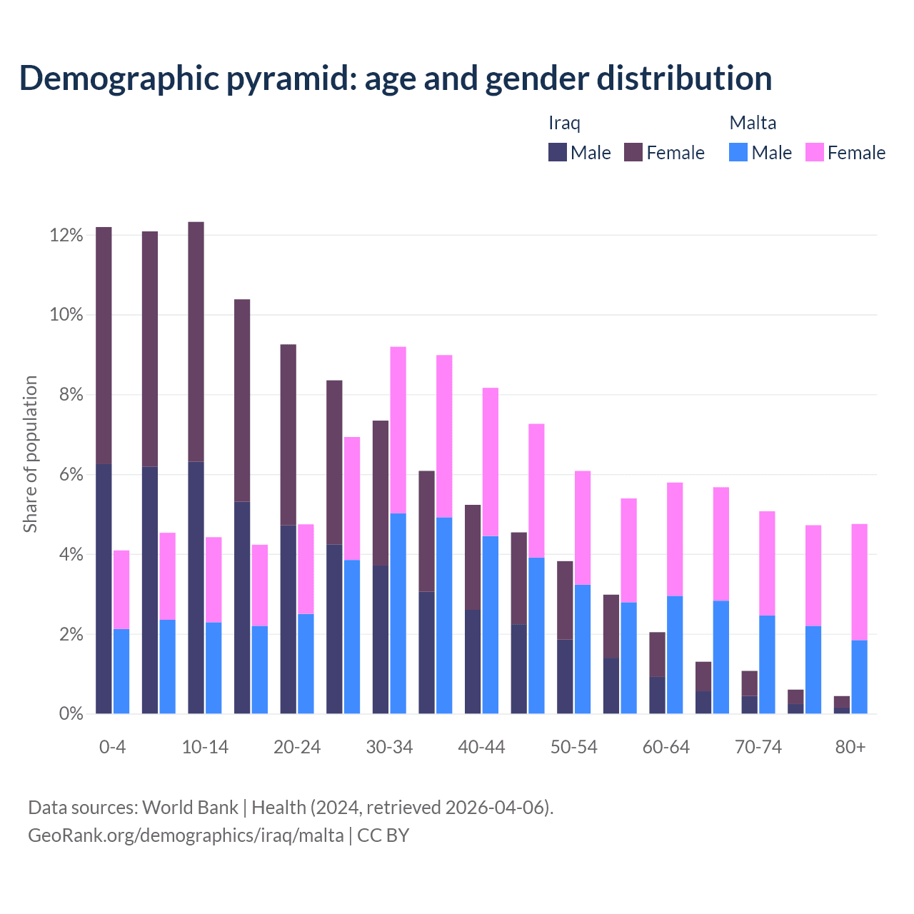 - As of 2026, the population of Iraq is 48.3M vs 582K in Malta - 83 times difference.