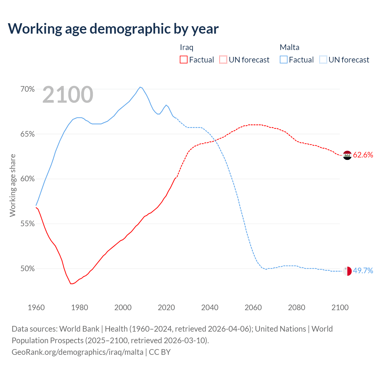 - Iraq has 29M working age adults (aged 15-64) vs 388K in Malta.