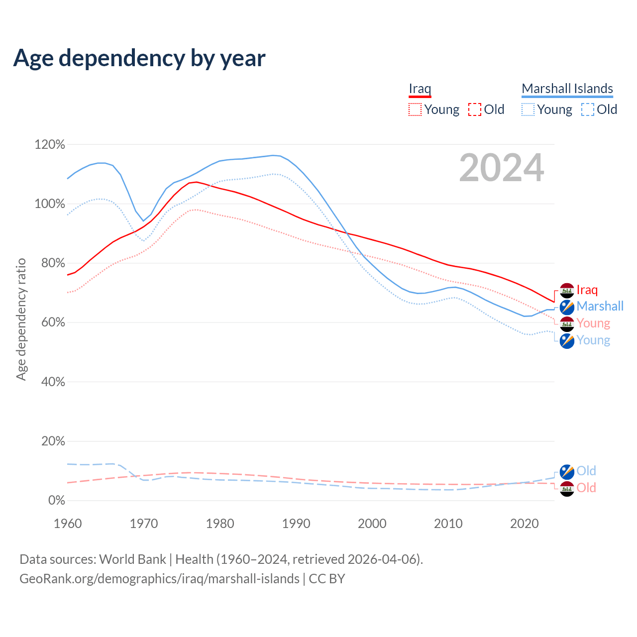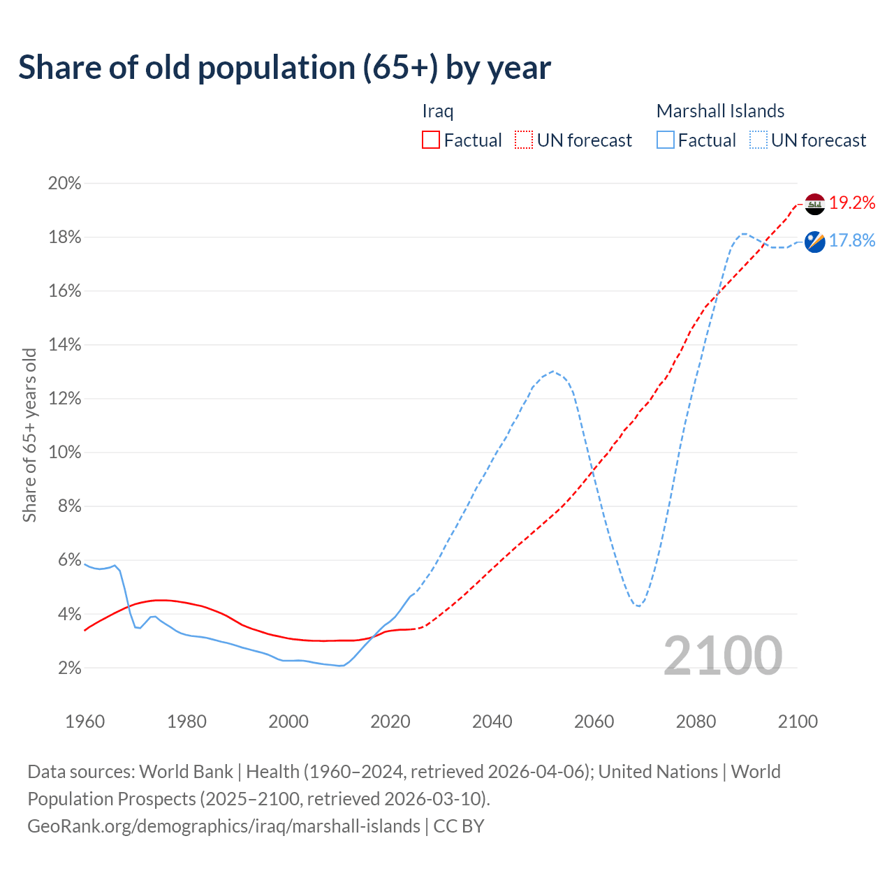 - The share of old-age demographic (65+) in Iraq is 3.41% vs 4.64% in the Marshall Islands.