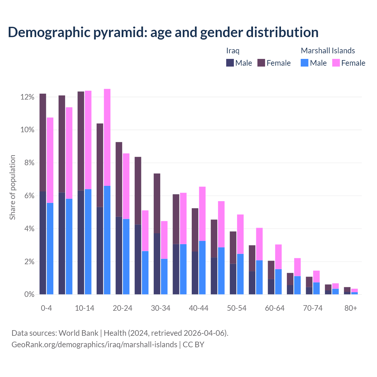 - As of 2026, the population of Iraq is 48.3M vs 35.1K in the Marshall Islands - 1,377 times difference.