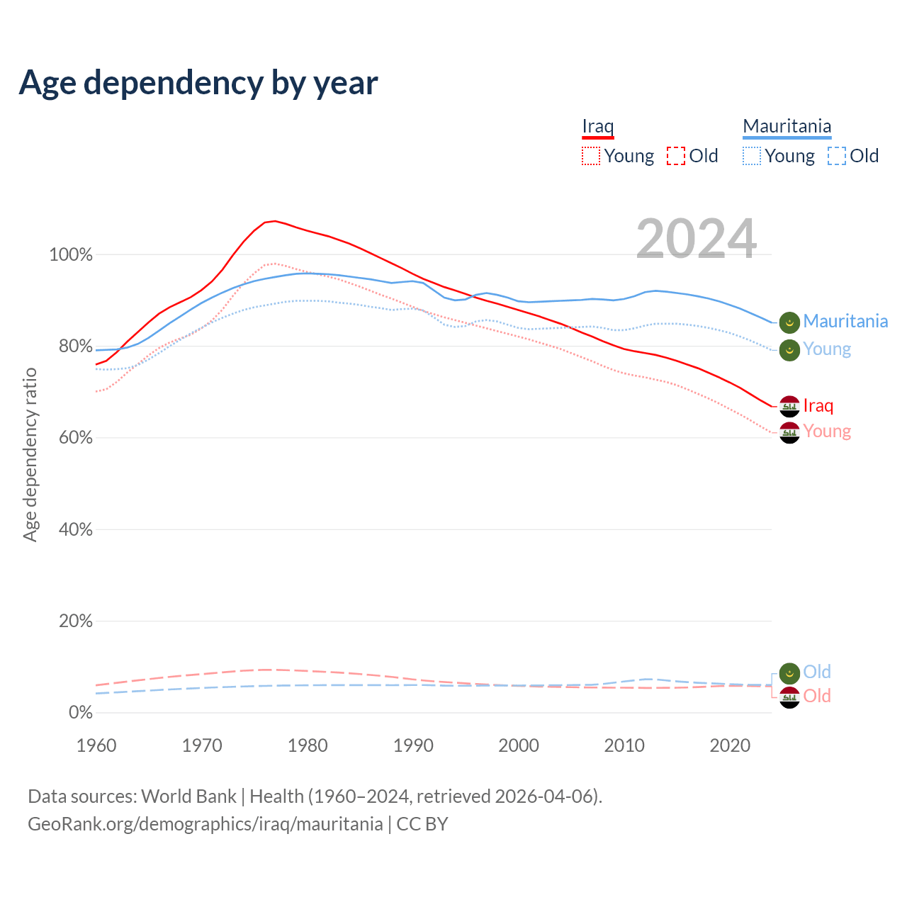 - The share of old-age demographic (65+) in Iraq is 3.41% vs 3.23% in Mauritania.