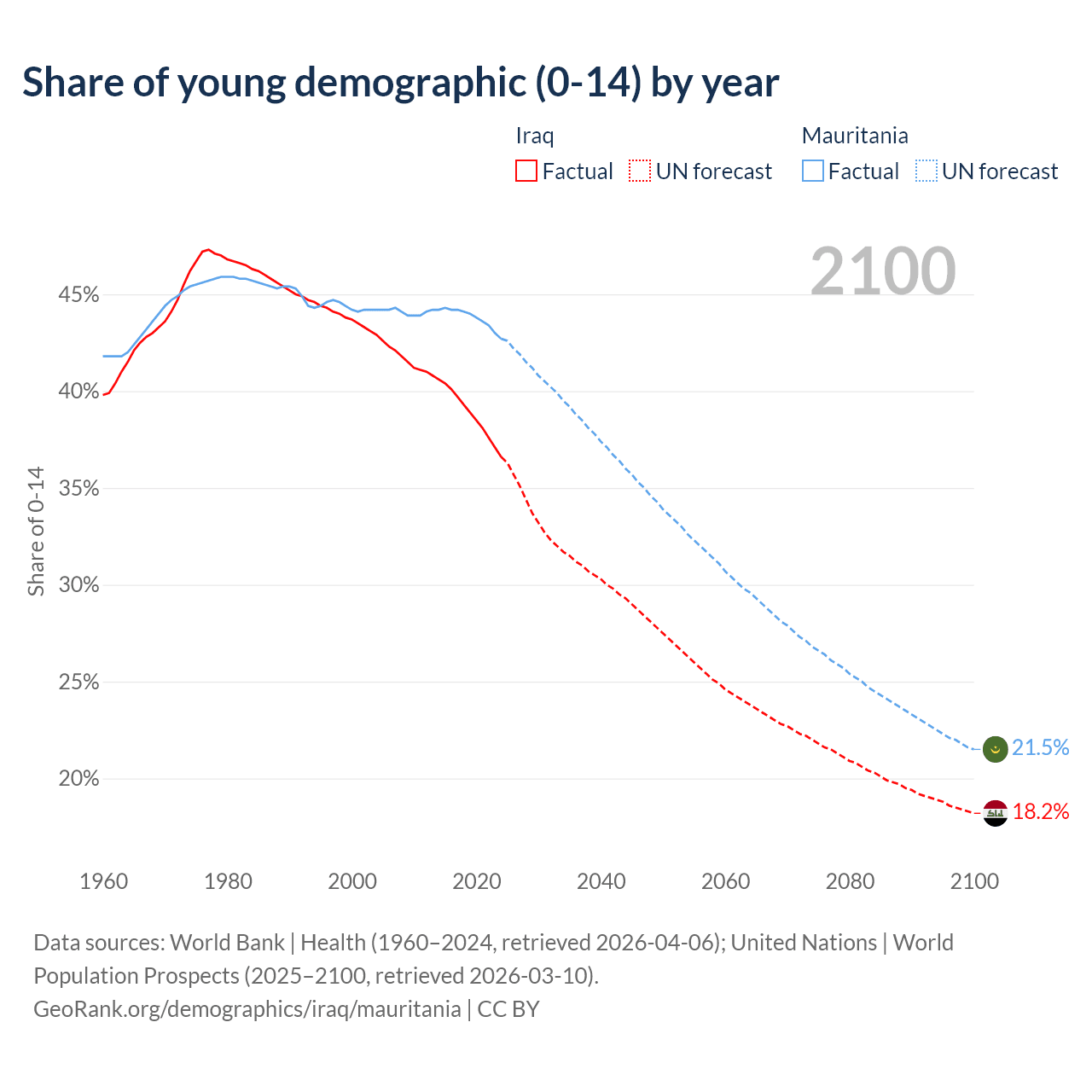 - The share of young demographic (0-15 years old) in Iraq is 36.6% vs 42.7% in Mauritania.