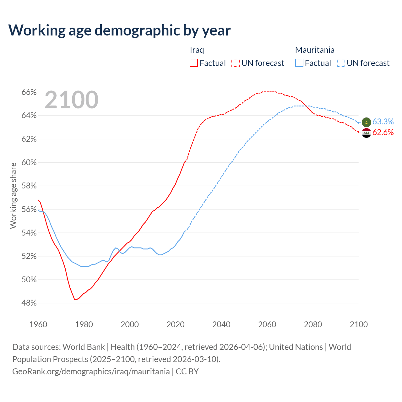Median age Iraq vs Mauritania, 1960-2100