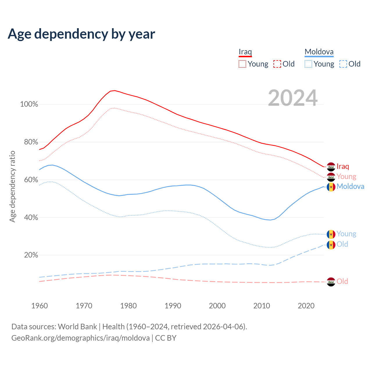 - Iraq is ranked 151/196 by median age (oldest to youngest) vs 54/196 for Moldova.