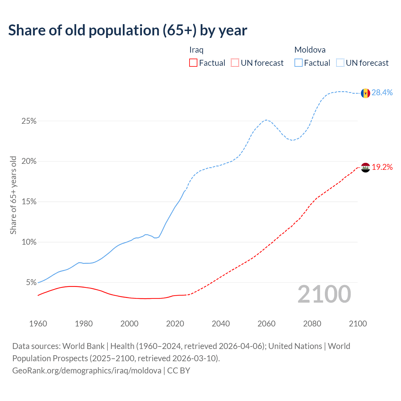 The share of older people aged 65 and over is 3.41% in Iraq and 16.2% in Moldova. Life expectancy in Iraq compared to Moldova .