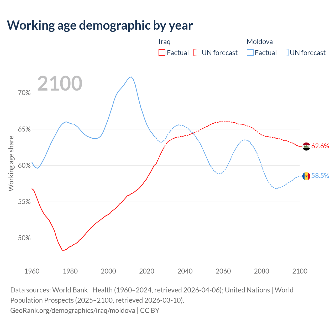 - Iraq has 29M working age adults (aged 15-64) vs 1.5M in Moldova.