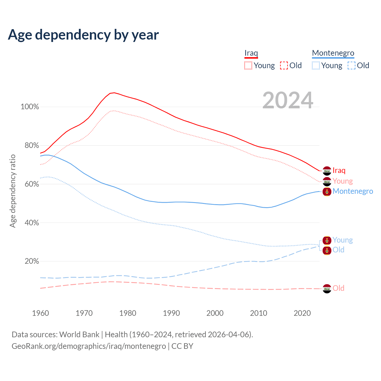 - The share of old-age demographic (65+) in Iraq is 3.41% vs 17.8% in Montenegro.