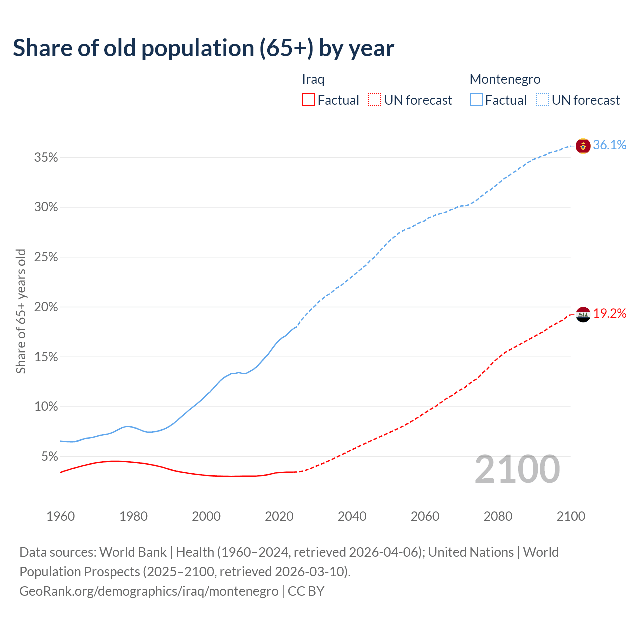 The share of older people aged 65 and over is 3.41% in Iraq and 17.8% in Montenegro. Life expectancy in Iraq compared to Montenegro .