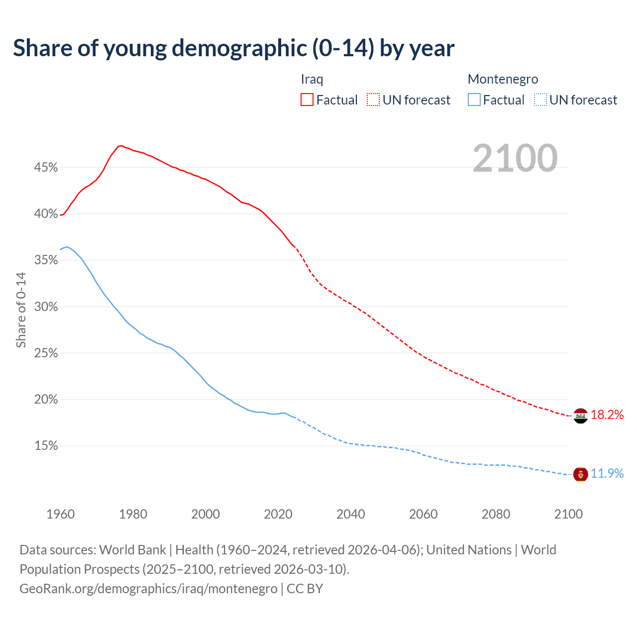 - The share of young demographic (0-15 years old) in Iraq is 36.6% vs 18.1% in Montenegro.