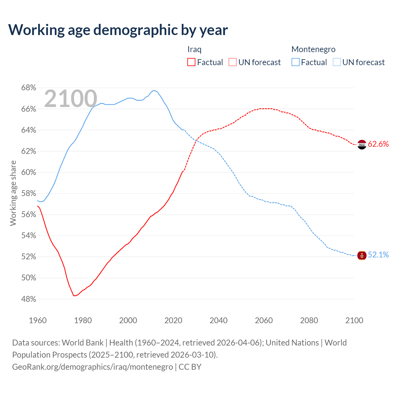 Median age Iraq vs Montenegro, 1960-2100