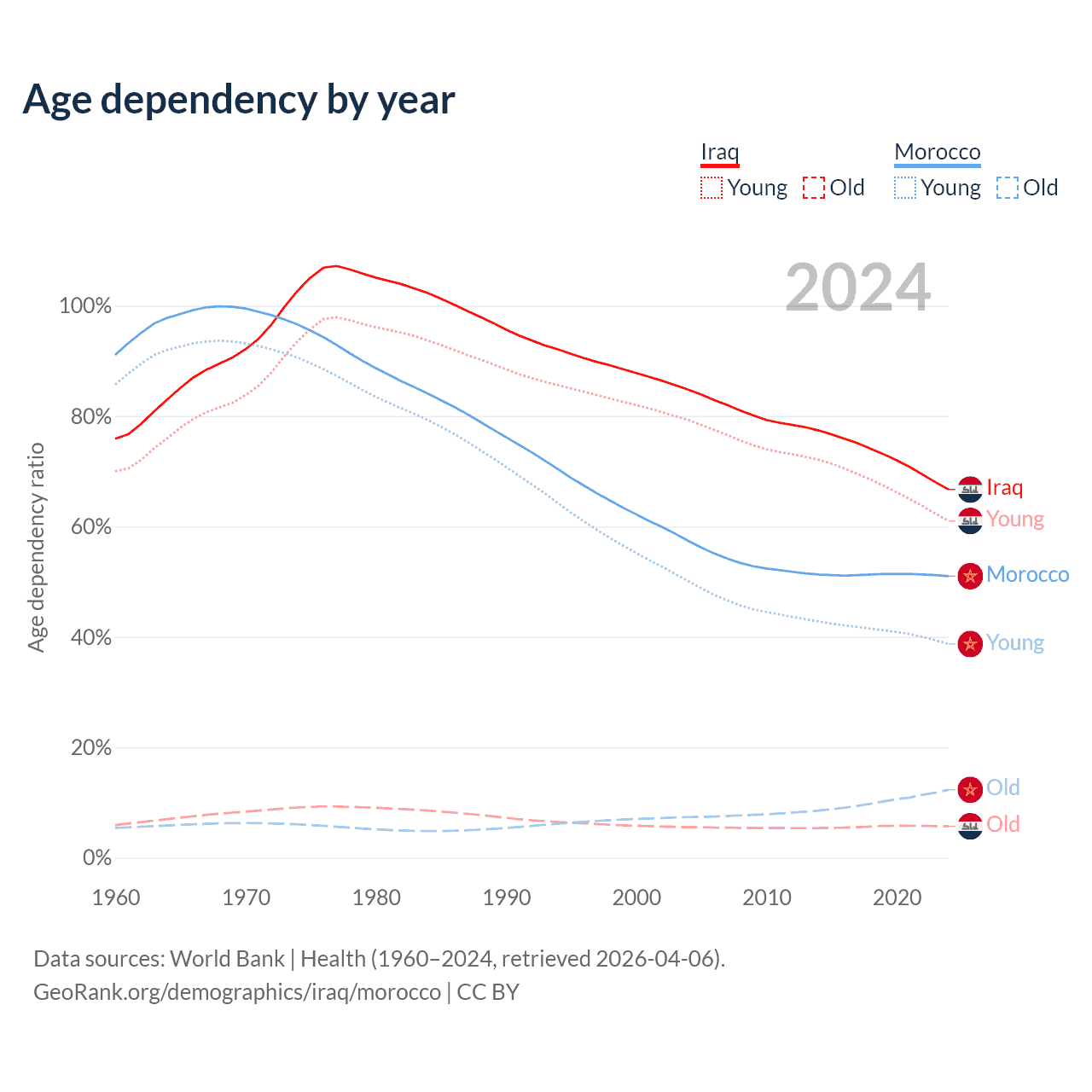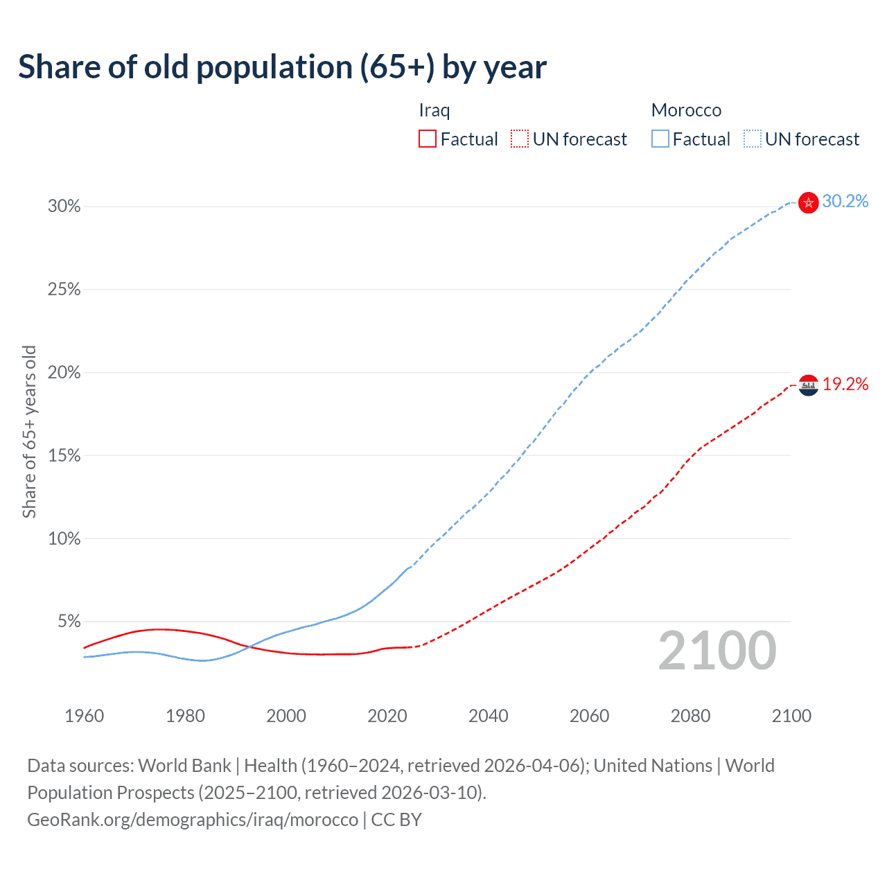 The share of older people aged 65 and over is 3.41% in Iraq and 8.14% in Morocco. Life expectancy in Iraq compared to Morocco .